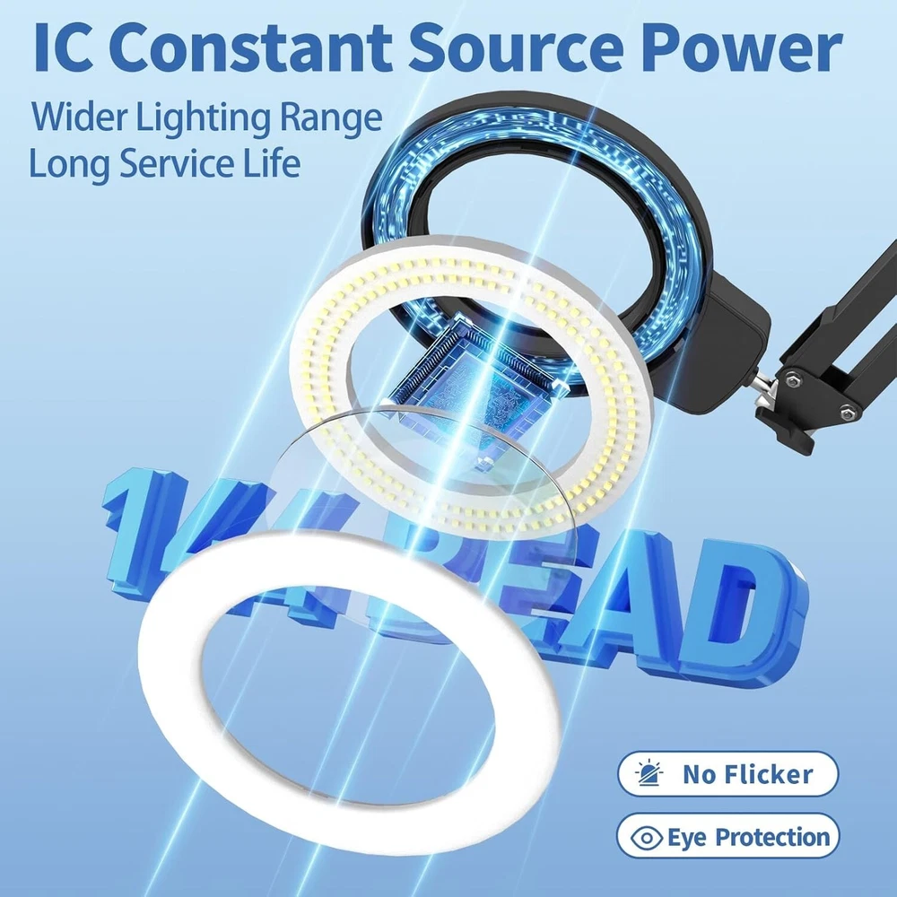 10X Magnifying Glass with Light Hands Free, 2024 New Upgrade Infinite Color and Brightness Magnifying Desk Lamp & Clamp, 2-in-1 LED Lighted Magnifier Stand for Craft Reading Hobby Close Work Product Description Finish Type Painted Base Material Aluminum Product Dimensions 42"D x 9.06"W x 2"H Item Weight 5 Pounds Lamp Type Desk Lamp About this item 【2024 New Head Rotating Knobs】Our magnifying lamp features a 360° horizontal head rotation knob for even force distribution and stability, preventing the lens from tipping over. Unlike traditional overhead Button that apply downward force and cause drooping, our design ensures stable performance. 【Infinite Color and Brightness】Our upgraded magnifying glass exceeds standard 3-color modes. Turn on the switch and use the two dials to control lighting: the left knob adjusts brightness for cool light LEDs, while the right knob adjusts warm light LEDs. Customize the color temperature exactly to your preference. 【10X HD Real Glass Magnifier】 Magnifying glass with light and stand equipped with 4.3-inch high-definition optical real glass lens, 10x magnification. Built-in light prevents glare, ensures clear and distortion-free vision, restores true colors, and provides a comfortable viewing experience. 【2-in-1 Design & Powerful Swing Arm】This magnifier with light serves as both a desk and clip lamp. Large 9.06-inch base prevents tipping, addressing issues with smaller bases. The sturdy metal clip is suitable for workbenches/desk/tables, and the 4 springs and 3 knobs ensure stability and flexibility. 【Memory Function & Cool-to-Touch Magnifying Desk Lamp】Our magnifying glass with light hands free features a memory function to restore the last used mode without readjustment. Additionally, the lamp head remains cool even after extended use, preventing overheating and ensuring safety and comfort.