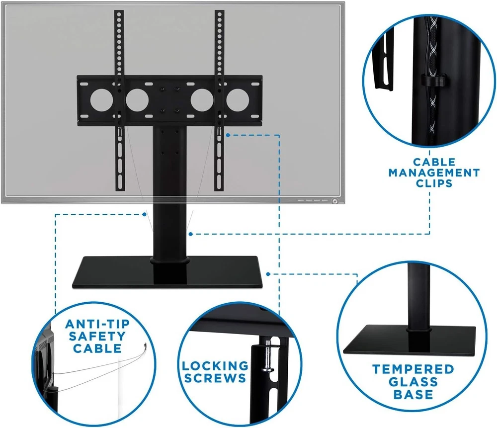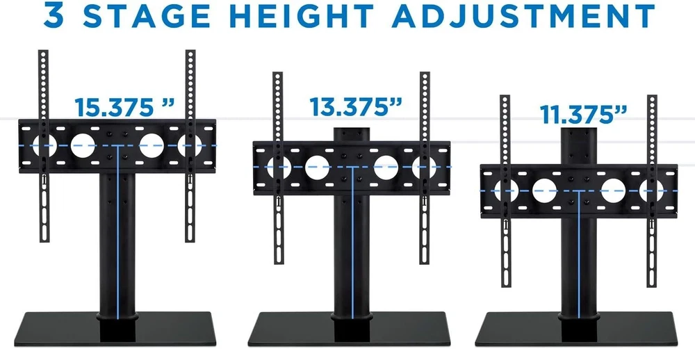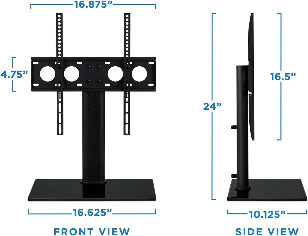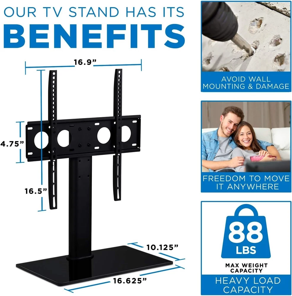 Compatible Devices: Television Color: Black Material Type: Glass Movement Type: Fixed Minimum Compatible Size: 27 Inches Maximum Compatible Size: 60 Inches UPC: Does Not Apply Features: Height Adjustable Type: Table Top Maximum Screen Size Fitment: 60 in Brand: Unbranded Mounting Type: Tabletop Mount Mount Type: Tabletop Mount Material: Glass gtin13: Does Not Apply Minimum-supported Screen Size: 27 Inches Mount Motion: Fixed Maximum Weight Fitment: 88 lb