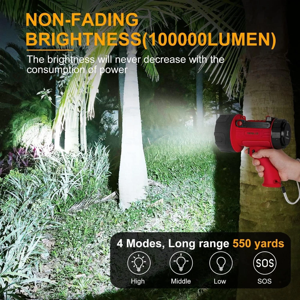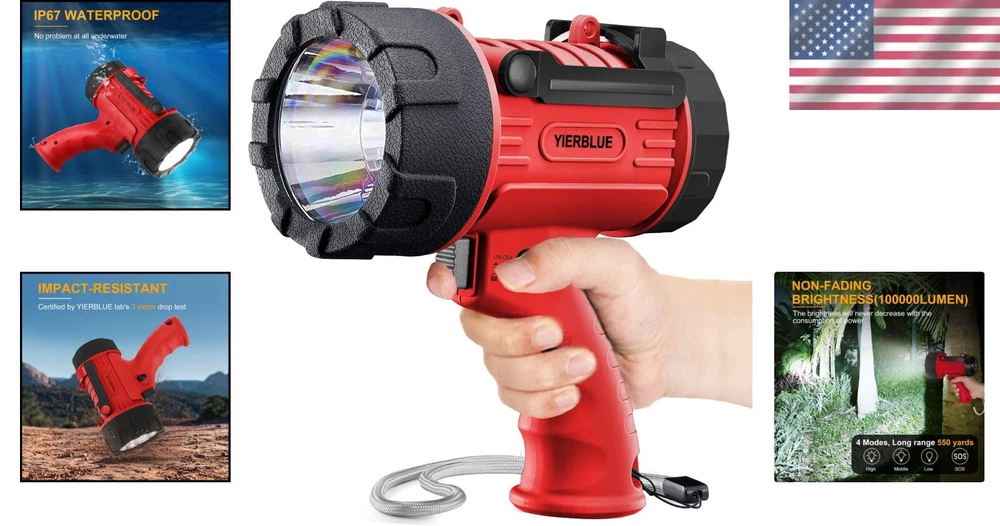 Item Package Quantity: 1 Number of Lights: 1-3 Light Source Type: Led Power Source: Battery Batteries Included?: Yes Number of LEDs: 1 Batteries Required?: Yes Lighting Technology: LED Lumens: 1000000 Light Path Distance: 550 Yards Product Dimensions: 4.5"d X 8.1"w X 8.1"h UPC: Does Not Apply IP Rating: IP67 gtin13: Does Not Apply Brand: Unbranded Color: Red-pro Batteries: 2 Lithium Polymer Batteries Required. (included) Voltage: 7.4 volts Brightness: 100000 Lumen Battery Cell Composition: Lithium Polymer Special Features: Durability Included Components: Batteries Included Personalize: No Type: Flashlight Features: Rechargeable, Waterproof, Batteries Included, Handheld, Power Bank, Adjustable Stand, Detachable Red Lens Number of Batteries: 2 Lithium Polymer Batteries Required. (included) Item Weight: 1.8 pounds Recommended Uses For Product: Camping, Boating, Hunting, Road Trips, Work Light Water Resistance Level: Waterproof Material: ABS, Silicone Special Feature: Durability White Brightness: 1000000 Lumens