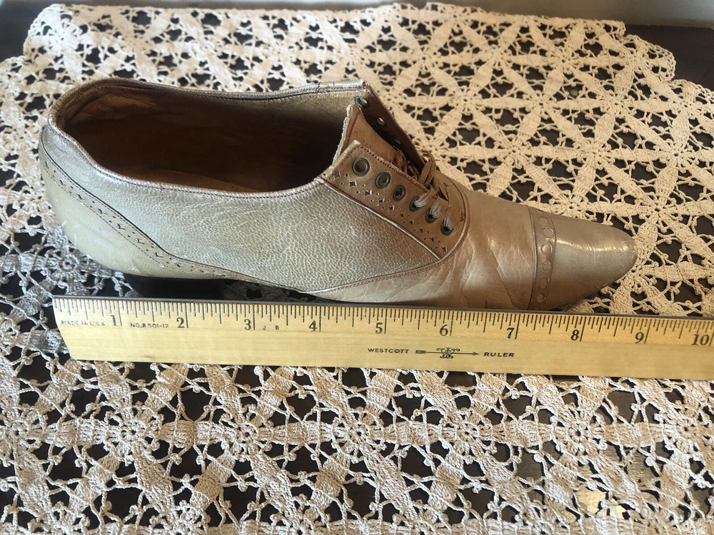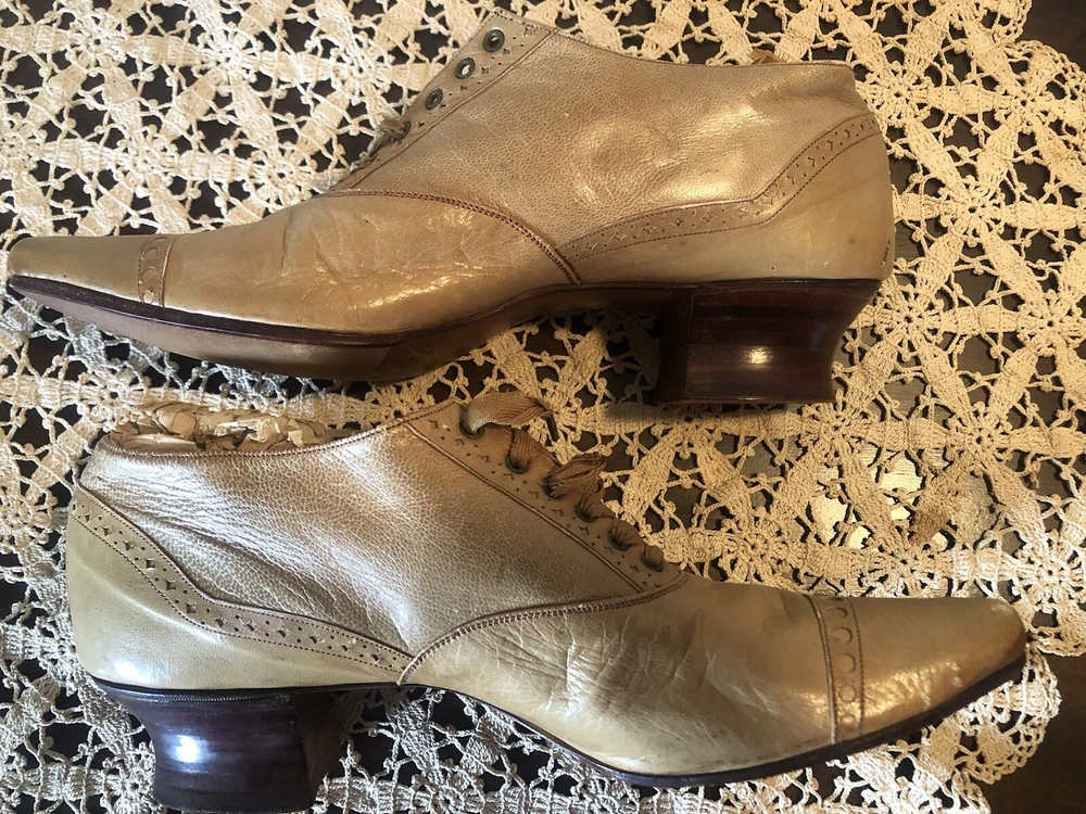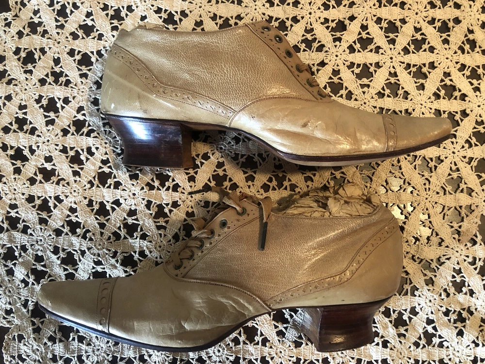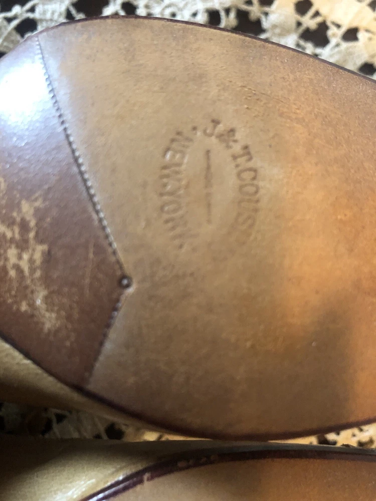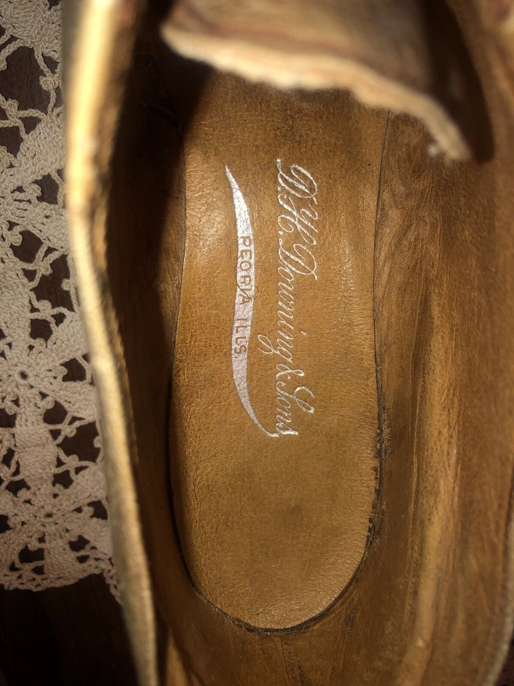 Very small Victorian women's shoes from the early 1900s. They are made of tan leather. The insole is stamped D.H. Downing & Sons, Peoria Ills. The sole is stamped with J & T Cousins, New York. These appear to be a handcrafted “one at a time” production. These shoes are a unique piece of history that would appeal to collectors of antique footwear or those interested in the fashion of the early 20th century.