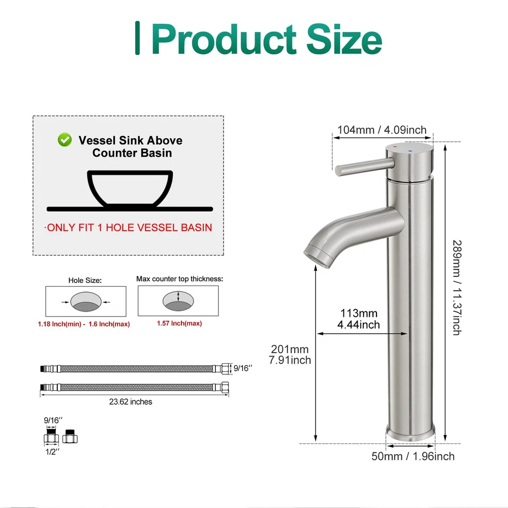 【High Quality】: Bathroom sink faucet body constructed from durable stainless steel, have registered with the CEC, with multi thicken nano electronic plating. It’s corrosion-resistant and processed high-precision surface treatment, ensuring durability and easy cleaning, keeps your bathroom clean and tidy. 【Drip-Free Stability】: Our bathroom sink faucets utilizes a high-sealing ceramic cartridge with drip-free performance. Successfully passed rigorous water tightness tests of 500,000 cycles, guaranteeing long-lasting stability and reliability. 【Eye-Catching】: Brushed Nickel construction can meet the daily use and achieve the purpose of corrosion resistance and provides a lightly brushed warm grey metallic look. 【Tall Vessel Sink Faucet】: Vessel faucet using high-lever processing technology, can match most bathroom sink.High water outlet in bathroom faucet vessel can be realised your different needs from others. vessel sink faucet make you look more atmospheric and more convenient to use. 【Easy to Install】 : Our bathroom faucets set comes complete with 3/8" threaded hot and cold supply hoses, (Complimentary 1/2" adapters available upon request.) Quality assurance,high bathroom faucet is easy to use. team can provide 24-hour support. If you are still in progress, please our friendly service team.