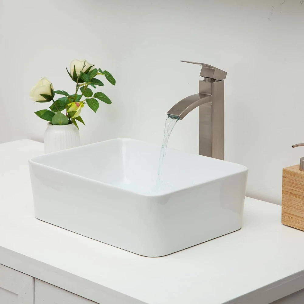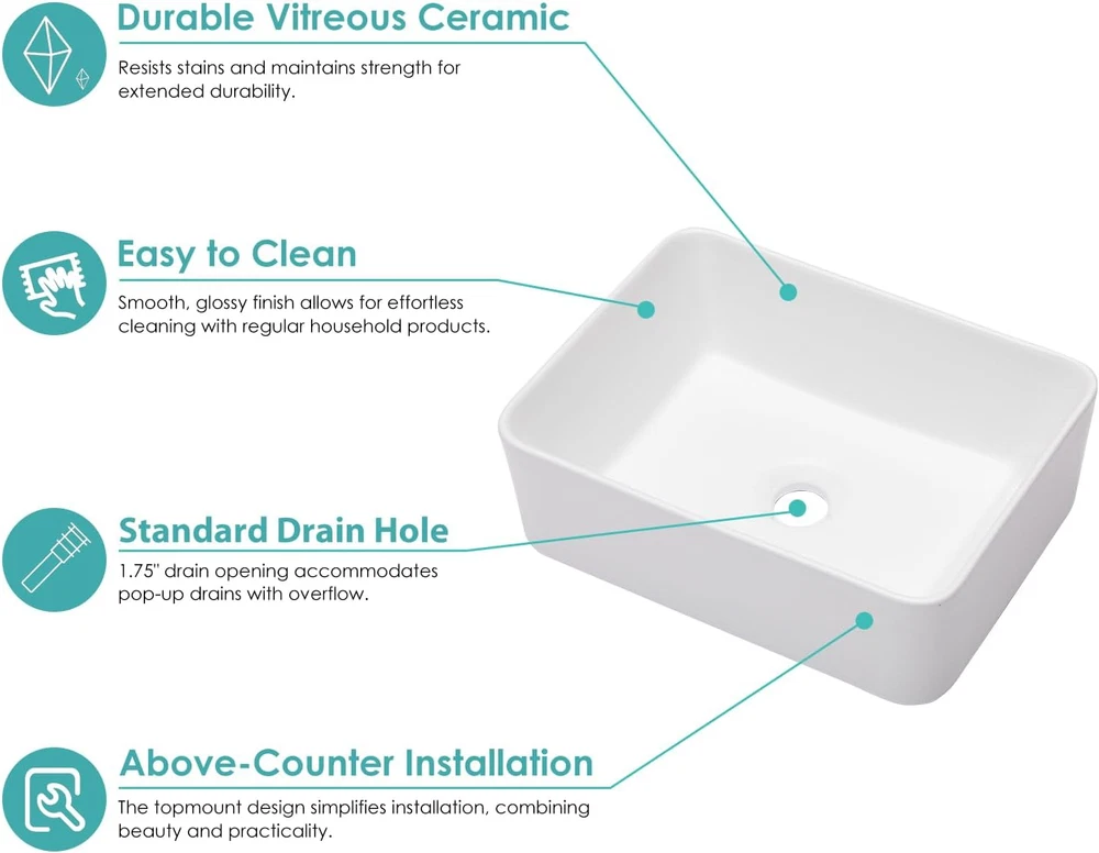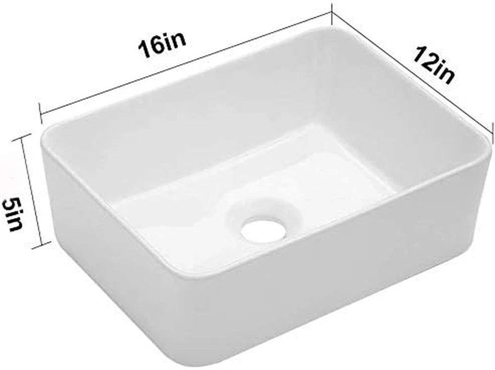 Store New Arrivals Add to Favorite View Feedback Contact Vessel Sink Rectangular - 16"X12" Modern White Bathroom Sink Rectangle above Counter Porcelain Ceramic Vessel Vanity Sink Art Basin Description Base Width 16 Inches Hole Count 1 Color White Product Dimensions 12"D x 16"W x 5"H Material Ceramic Material Type Ceramic Item Weight 21 Pounds Drain Type Pop-Up Shape Rectangular Product Care Instructions Wipe with Damp Cloth Finish Types Polished Installation Method Countertop Item Dimensions D x W x H 12"D x 16"W x 5"H Style Name Modern Size 16"X12" Versatile Vessel Sink: Kichae Beautiful & fancy white vessel sinks are designed and welcomed for any locations, like home bathroom, restaurant, school, indoor or outdoor. Gives an amazing and gorgeous look. Easy to Clean : Interior and exterior smooth, non-porous glaze makes this white bathroom vessel sink more silky and protect the sink surface against stains, making it easy to clean. Constructed with super sturdy and durable with long-lasting & high density ceramic material, our sink can keep new even after many years of using. Easy to install: rectangular above counter bathroom sink, allows you install your bathroom sink on receiving it. Our package has updated foam to well protect the sink from shipping damage. Exterior dimensions: 16"x12"x5", our rectangle white bathroom sink has US standard 1.75”drain opening, please notice that: faucet and sink drains are not included in the package. Well Packed: Each item is wrapped in a specially customized anti-collision foam, to maximize the protection in transporting and avoid potential damage. Our most important goal is to deliver products to you in good condition and satisfy your needs Product Description Kichae 16"x12" Modern Bathroom Vessel Sink Rectangular Versatile Vessel Sink - Kichae Beautiful & fancy white sinks are designed and welcomed for any locations, like home bathroom, restaurant, school, indoor or outdoor. Gives an amazing and gorgeous look. Why Choose Kichae Bathroom Vessel Sink? This modern white bathroom sink offers a sleek and elegant design that will elevate the look of your bathroom. Hand crafted from high-quality porcelain ceramic , it boasts a smooth, non-porous surface that is easy to clean and resistant to stains. The rectangular shape and above-counter design provide a spacious basin for your daily grooming routine. With its fast drainage and easy installation , this vessel sink is a practical choice for any bathroom renovation or new construction project. Kichae Bathroom Sink have many sizes, color and models for you to choose from, as well as above counter, under counter and wall mounted. 24H : Feel free to reach out to us if you have any questions. Discover the perfect blend of style and functionality with the Kichae Vessel Sink Rectangular. Please confirm the size you need Kichae 16" x 12" Bathroom Rectangle Sink Exterior dimensions - 16 "x 12"x 5" Interior dimensions- 15.17" X 11.03" X 4.1" US standard 1 3/4”drain opening. Easy to install Kichae White Vessel Sink Rectangular Features More Detail of This Rectangular Bathroom Vessel Sink: Fast Drainage The bottom of the white bathroom vessel sink slopes towards the center for fast drainage . Rectangle Bathroom Sink Constructed with super sturdy and durable with long-lasting & high density ceramic material, keep new even after many years of using. Deep Vessel Sink Bowl With a depth of 4 1/2 inches , this bathroom sink effectively reduces splashing during hand washing or brushing. Round Corner Bathroom Sink Interior and exterior smooth , non-porous glaze makes this vessel sink more silky and protect the sink surface against stains, making it easy to clean. Discover the perfect blend of style with the Kichae Vessel Sink: Add to Cart Add to Cart Add to Cart Add to Cart Add to Cart Add to Cart Add to Cart Customer Reviews 4.6 out of 5 stars 944 4.6 out of 5 stars 944 4.6 out of 5 stars 944 4.6 out of 5 stars 944 4.6 out of 5 stars 213 4.6 out of 5 stars 944 4.6 out of 5 stars 944 Price $79.00 $ 79 . 00 $82.00 $ 82 . 00 $69.00 $ 69 . 00 $79.00 $ 79 . 00 $79.00 $ 79 . 00 $69.00 $ 69 . 00 $69.00 $ 69 . 00 Size 16 x 12 x 5 inch 16 x 12 x 5 inch 16 x 12 x 5 inch 19 x 15 x 5 inch 16 x 13 x 6 inch 15 x 7 x 3.5 inch 21 x 13 x 6 inch Color White Matte Black White Matte Black White White White Shape Rectangular Rectangular Rectangular Rectangular Oval Rectangular Rectangular Installation Type Above Counter Above Counter Above Counter Above Counter Above Counter Wall mount Wall mount Material Ceramic Ceramic Ceramic Ceramic Ceramic Ceramic Ceramic ABOUT US We offer the best prices around on high quality products. Our E-store includes media such as books, movies, music and games while offering electronics, toys, sporting apparel, clothing, tools, general home, garden items and more. SHIPPING We are always working hard to ensure your package arrives as soon as possible. Please understand that some factors like weather, high postal traffic, and the performance of shipping companies are outside of our control. We offer free shipping to the lower 48 states and ship within 2 business days of payment, usually sooner. We do not accept P.O. Boxes. Please provide a physical address. For shipping outside of the continental USA, we only use eBay's Global Shipping Program.The item is shipped to KY and then sent to the rest of the world. International customers are responsible for all duties and taxes. Continue to check out in order to calculate costs for shipping the item to your country. Messages regarding eBay's Global Shipping Program MUST be directed at eBay EXCLUSIVELY. RETURNS We offer a 30-Day Return Policy on items which you are not completely satisfied with. You have the option for a full-refund or an exchange of the item. No returns are available on items shipped outside of the USA. PAYMENT We accept PayPal. CONTACT US This page content is yet to come Please ad us to your favorite seller and visit again later Thank You CUSTOMER SAT