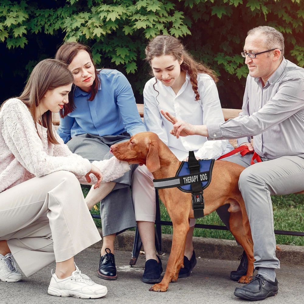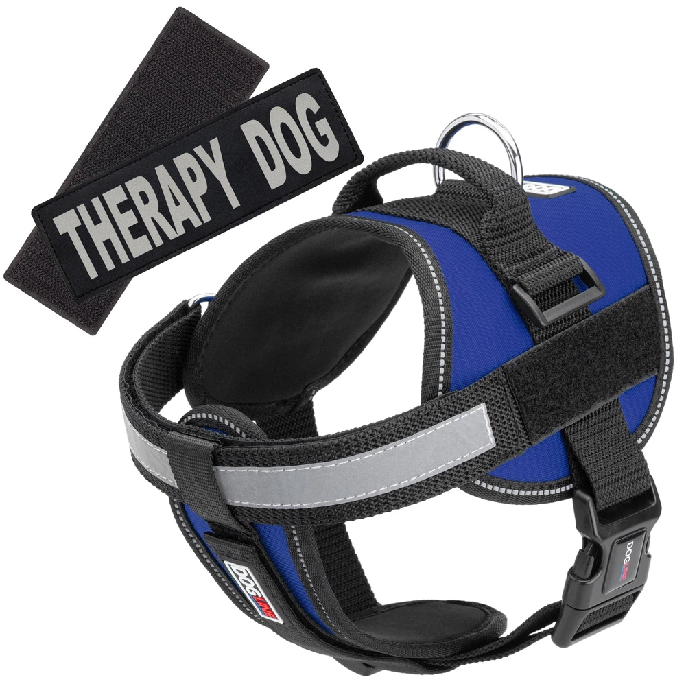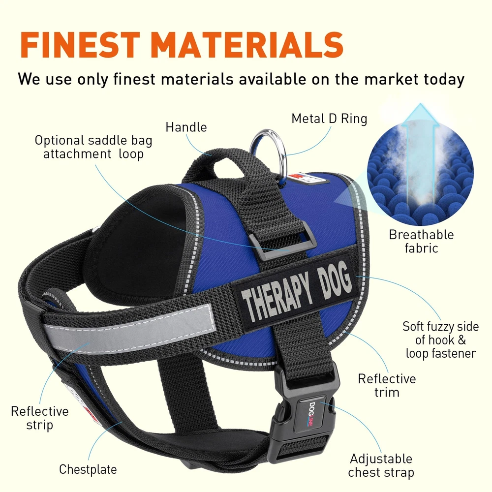 Dog line Unimax Multi-Purpose Dog Vest Harness with Removable Chest Plate and Therapy Dog Removable Patches. These harnesses are perfect for service dogs, training dogs, therapy dogs, alert dogs and a lot more. These harnesses are made of durable breathable nylon with neoprene lining. Machine washable and weather resistant materials make this harness low maintenance and very practical in all life situations. These harnesses come with removable chest plate to provide maximum comfort for the dog. Chest plates and trim around the harness are reflective for maximum safety. EZ Grab handle provides total control of the dog in any situation. Please measure your dog's girth behind front legs at the widest point before ordering. Made of durable, water resistant materials; lined with padded neoprene for comfort; assembled and ready to use Removable/Interchangeable THERAPY DOG patches included for both sides of the vest Adjustable front and underbelly straps; removable chest plate; quick release buckle Top of training vest contains a durable built in handle for extra control Reflective front strap, trim and lettering on patches