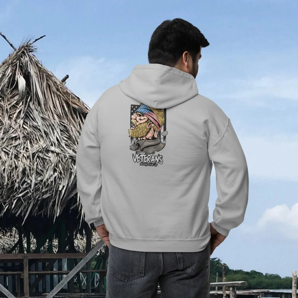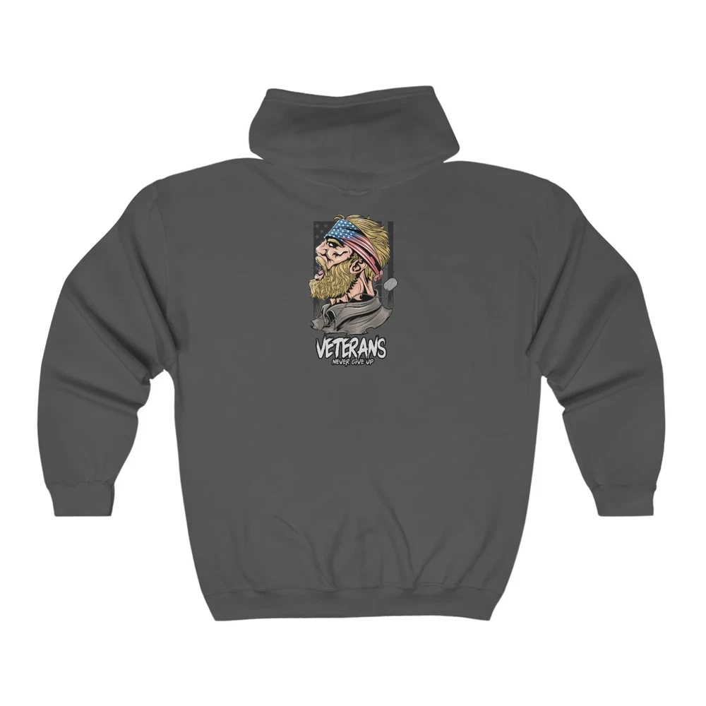 This Full Zip classic fit Hoodie is designed for veterans and features a back print design. Made of high-quality materials, it offers comfort and durability. Stay warm in style while showing support for our brave Veterans. Overview; The classic comfy zip-up, featuring air-jet spun yarn for a softer fleece with reduced pilling. Once put on, it will be impossible to take off. Durable silver-colored metal zipper with metal puller. This heavy blend hooded sweatshirt is relaxation itself. Made with a thick blend of cotton and polyester, it feels plush, soft and warm, a perfect choice for any cold day. In the front, the spacious kangaroo pocket adds daily practicality while the hood's drawstring is the same color as the base sweater for extra style Points. Fabric; Made with a medium-heavy fabric (8.0 oz/yd² (271 g/m²)) that consists of 50% cotton and 50% polyester for that cozy feel and warmth you need in a Hoodie. Fit; The classic fit along with the pouch pocket make for a highly comfortable, scratch-free wearing experience. Adjustable hood with self-colored woven cord and buttonhole openings for the Cord. Fabric blends; Heather Sport colors -may contain more than 50% polyester.