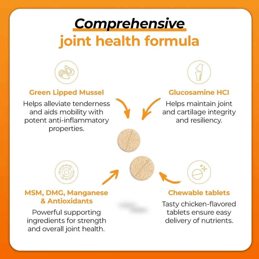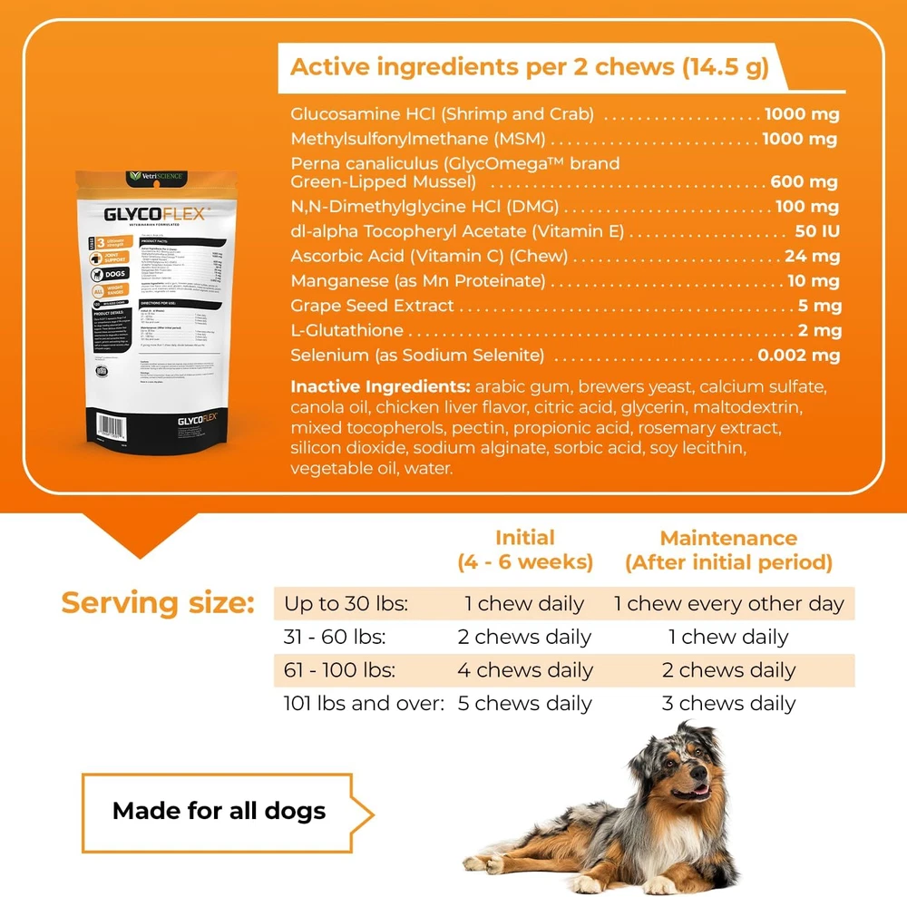 Store New Arrivals Add to Favorite View Feedback Contact Vetriscience Glycoflex 3 Clinically Proven Hip and Joint Supplement for Dogs - Maximum Strength Dog Supplement with Glucosamine, MSM, Green Lipped Mussel & DMG - 120 Chewable Tablets, Chicken Flavor Description Item model number 900669.06 Age Range Description All Life Stages Warranty Description Manufacturer Quality Assurance Guarantee Number of Items 1 Active Ingredients Glucosamine HCI, Chondroitin Sulfate (Porcine), Perna Canaliculus (Green-Lipped Mussel) Style Glycoflex Stage 3 Target Audience Keyword reptiles | amphibians ), dogs Department dog-hip-joint Breed Recommendation All Breed Sizes Brand Name VETRISCIENCE Product Dimensions 5 x 3 x 7 inches; 6.4 ounces Flavor Name 120 Tablets Directions Directions for Use: Initial: (4 - 6 Weeks) Up to 30 lbs: 1/2 tablet daily 31 - 60 lbs: 1 tablet daily 61 - 100 lbs: 2 tablets daily 101 lbs and over: 2 1/2 tablets daily Maintenance: (After initial period) Up to 30 lbs: 1/2 tablet every other day 31 - 60 lbs: 1/2 tablet daily 61 - 100 lbs: 1 tablet daily 101 lbs and over: 1 1/2 tablets daily If giving more than 1 tablet, divide between AM and PM. Is Discontinued By Manufacturer No Item Package Dimensions L x W x H 7.17 x 3.74 x 3.66 inches Included Components 1 Bottle Model Name Glycoflex 3 Country of Origin United States Item Weight 6.4 ounces Specific Uses for Product Joints, Hip Item Dimensions LxWxH 5 x 3 x 7 inches Color 120 Tablets Item Form Tablet Flavor 120 Tablets Manufacturer FoodScience, LLC Brand VETRISCIENCE Size 120 Tablets for All Dogs Clinically proven hip and joint support supplement for dogs: From the veterinarian-formulated brand comes the only dog joint supplement clinically proven to increase hind leg strength in just 4 weeks* Maximum strength joint health formula: Our GlycoFlex 3 canine formula combines 10 active ingredients including green lipped mussel, glucosamine for dogs, MSM, DMG, and antioxidants to help improve joint integrity, strength, mobility and function Dog hip and joint supplement: Our dog supplement comes in delicious natural imitation roast chicken flavored chewable tablets and is recommended by veterinarians for dogs with a maximum need for joint and connective tissue support High-quality ingredients: Our dog and cat supplements are certified by the National Animal Supplement Council (NASC), routinely undergo third-party testing and contain no hidden ingredients, artificial flavors, synthetic colors or preservatives Veterinarian-formulated and approved: Formulated with the expertise of scientists and veterinarians, and trusted by over 15,000 veterinary clinics in the U.S., VetriScience only makes supplements that vets feel confident giving to their own pets This formula for dogs of all sizes is made with green-lipped mussel, glucosamine, MSM, and other beneficial nutrients to support joint health and mobility. Imitation chicken flavor is appropriate for pets with sensitivities to protein, and convenient chewable tablets make it easy to provide powerful daily joint support for dogs. Your dog can also enjoy the benefits of advanced joint support in GlycoFlex® Stage 3 bite-sized chews, which are tasty and chewy enough to be given as a daily treat! For our smaller canine friends, consider GlycoFlex® Stage 3 for Small Dogs (under 30 pounds). Its the same powerful recipe but formulated specifically for small-breed dogs. What is the difference between GlycoFlex® and GlycoFlex® Plus Tablets? Understanding pet joint health is key to understanding joint supplement ingredients and their strength. A wider variety of active ingredients + higher levels of those active ingredients = a more powerful supplement. GlycoFlex® Stage 3 is formulated with 1000 mg of glucosamine, 1000 mg of MSM, and 600 mg of green-lipped mussel per 1 tablet GlycoFlex® Plus is formulated with 800 mg of glucosamine, 500 mg of MSM, and 300 mg of green-lipped mussel per 1 chewable tablet, plus 250 mg of chondroitin to deliver an extra boost of mobility support For best results, both of these GlycoFlex® supplements recommend a loading dose period of 4-6 weeks. ABOUT US We offer the best prices around on high quality products. Our E-store includes media such as books, movies, music and games while offering electronics, toys, sporting apparel, clothing, tools, general home, garden items and more. SHIPPING We are always working hard to ensure your package arrives as soon as possible. Please understand that some factors like weather, high postal traffic, and the performance of shipping companies are outside of our control. We offer free shipping to the lower 48 states and ship within 2 business days of payment, usually sooner. We do not accept P.O. Boxes. Please provide a physical address. RETURNS We offer a 30-Day Return Policy on items which you are not completely satisfied with. You have the option for a full-refund or an exchange of the item. No returns are available on items shipped outside of the USA. PAYMENT We accept PayPal. CONTACT US This page content is yet to come Please ad us to your favorite seller and visit again later Thank You CUSTOMER SATISFACTION We try our very best to make sure every customer is completely satisfied. If there's a problem, message us! We're happy to help.
