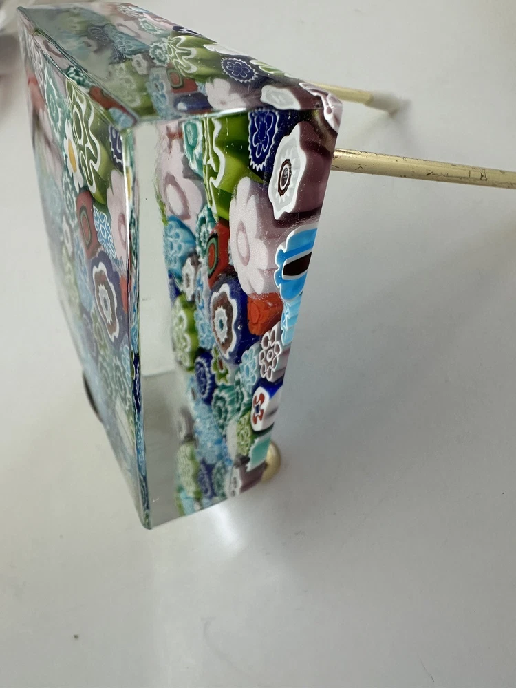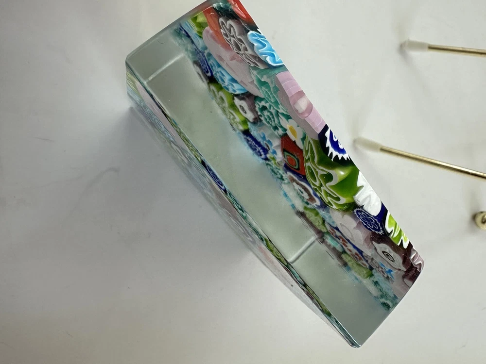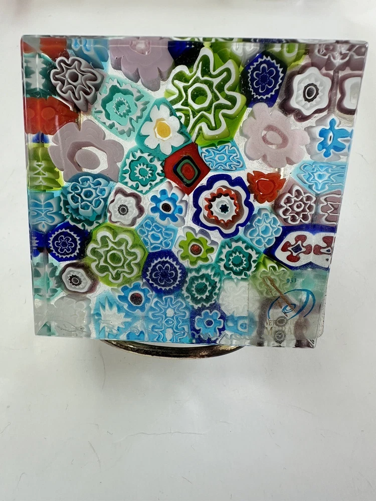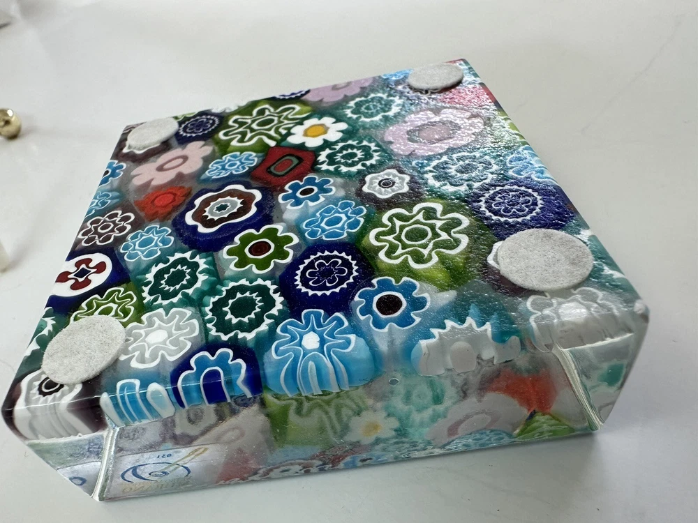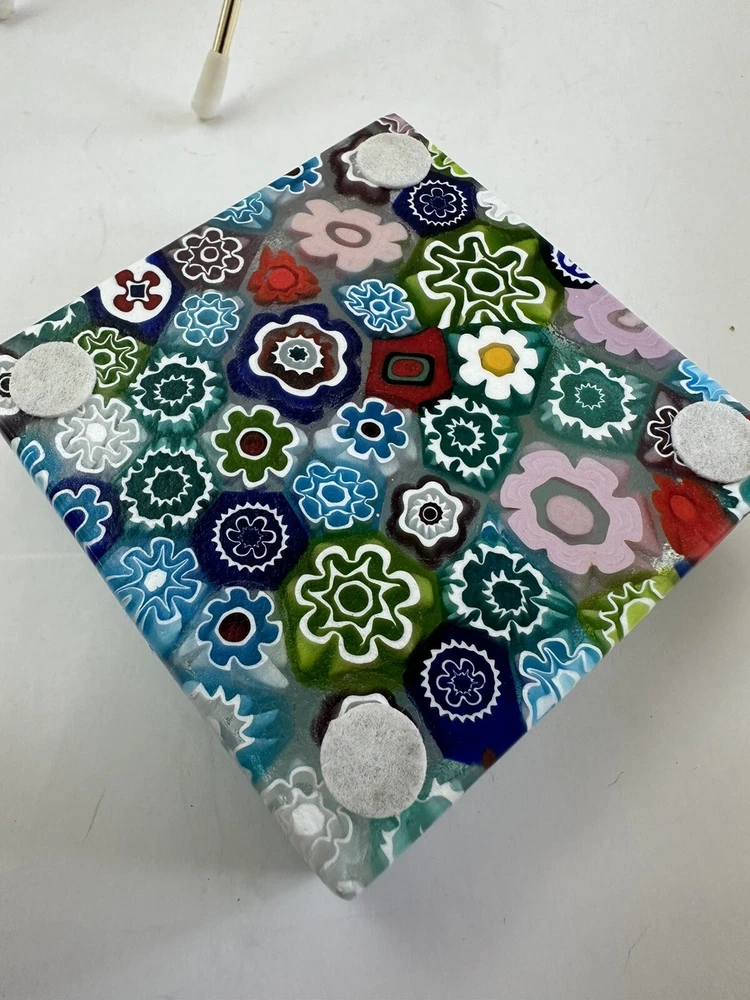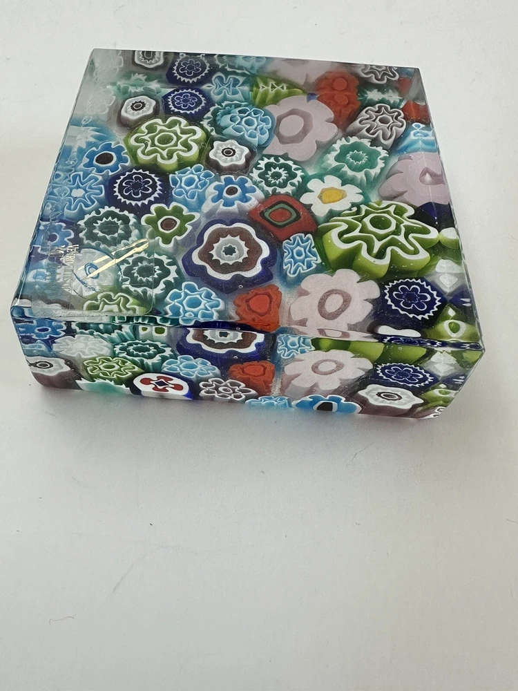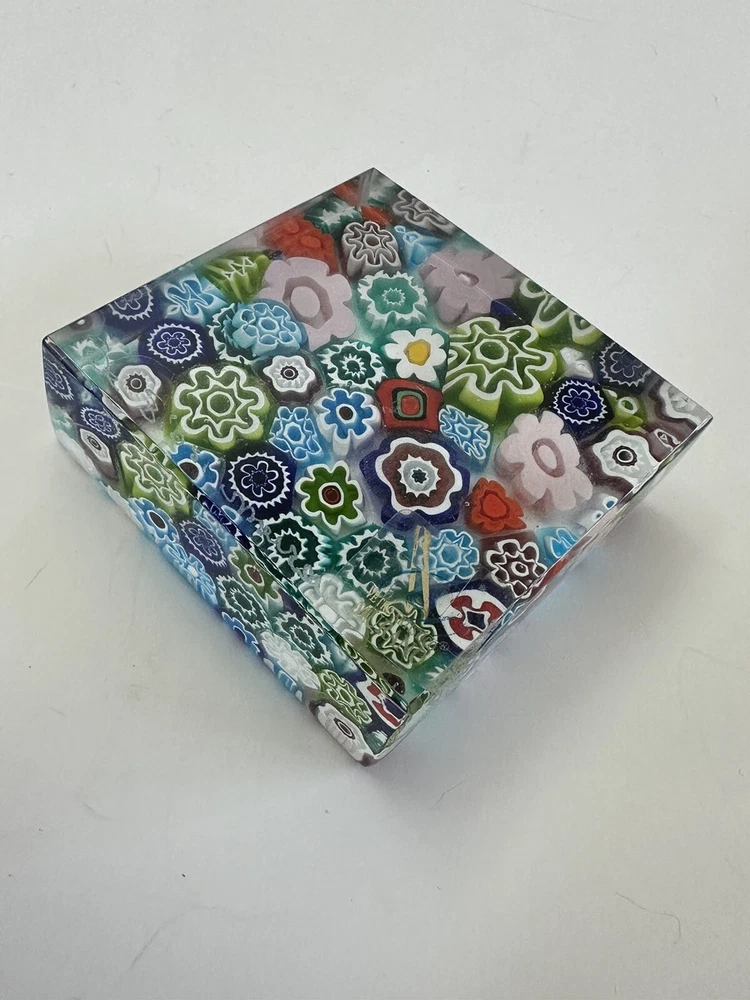 This beautiful paperweight is a stunning piece of Murano glass art. Hand blown in Italy, it features a intricate floral pattern in a variety of vibrant colors. The piece measures 2.75 inches in both length and width, making it a perfect addition to any collection. With its traditional style and production technique of millefiori, this paperweight is a true work of art. The label of Vetro Artistico Murano is still attached and its signed Si Siosi Murano ,adding to its authenticity and value. This item is perfect for anyone who appreciates the beauty of glass art and wants to add a unique piece to their collection. Makers Mark: Hand inscribed to edge of the top surface, "Si Siasi Murano" and it still retains the original label, "Vitro Artistico Murano". An excellent modern design. A colorful block with close packed millefiori ground of orangey-red, blue, white, & green and pink floral canes.