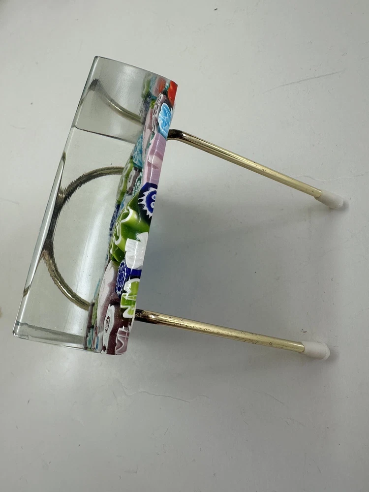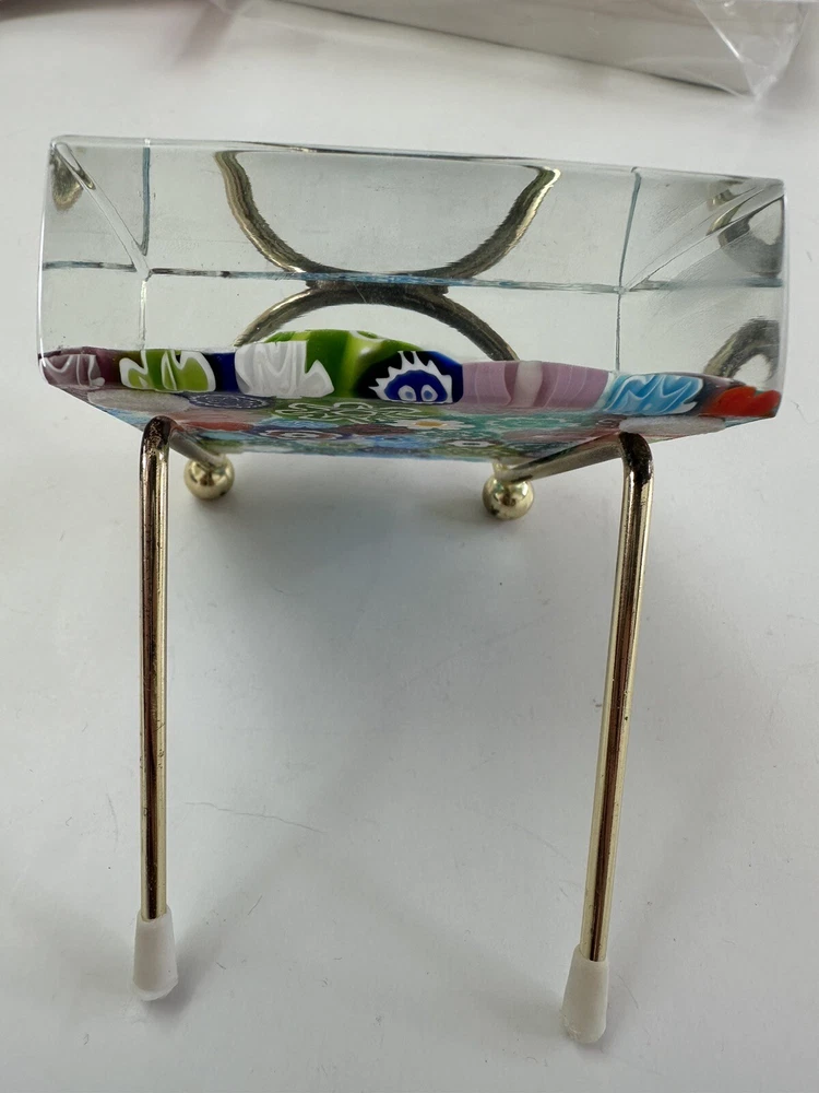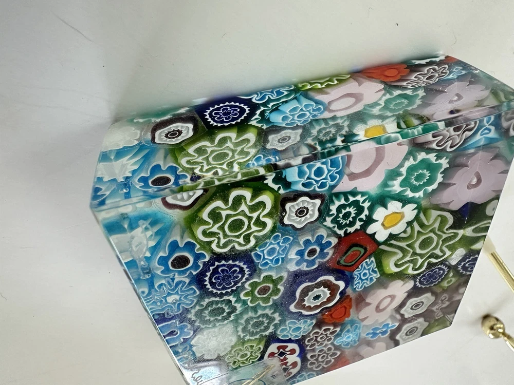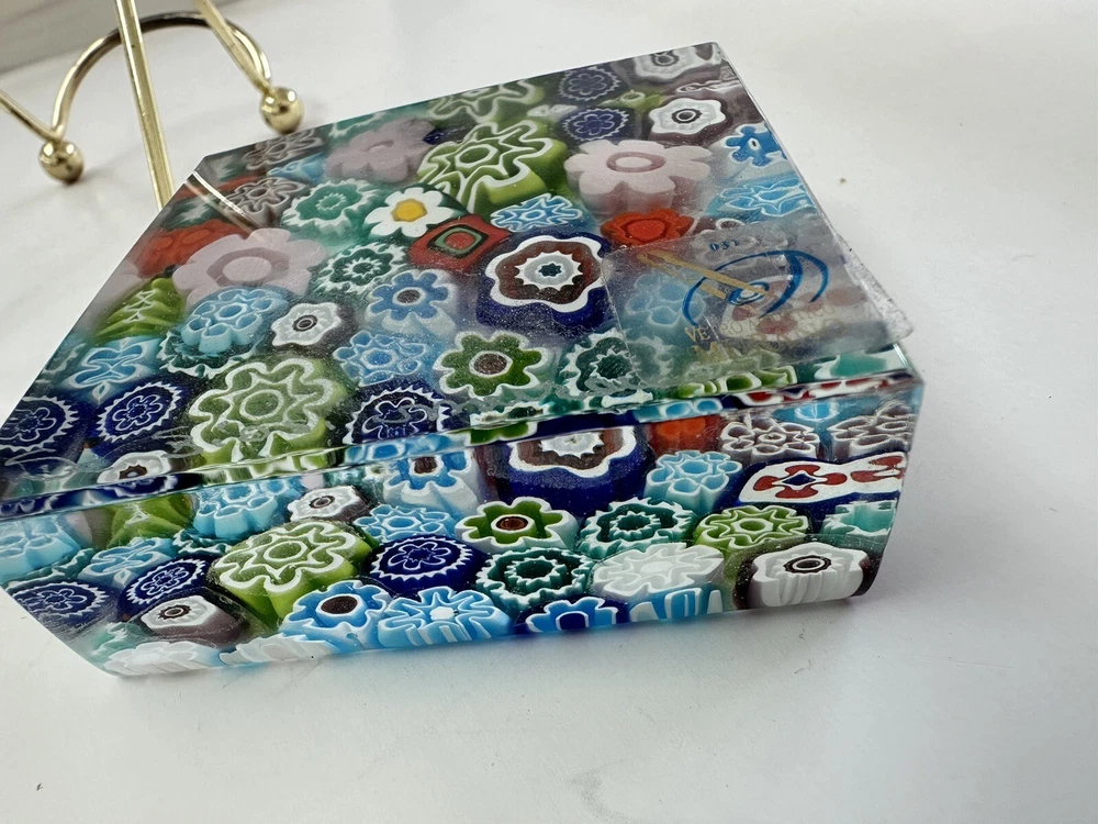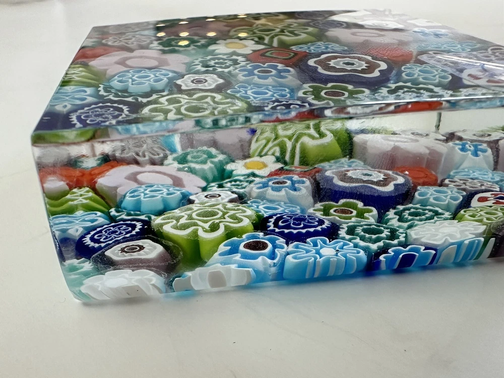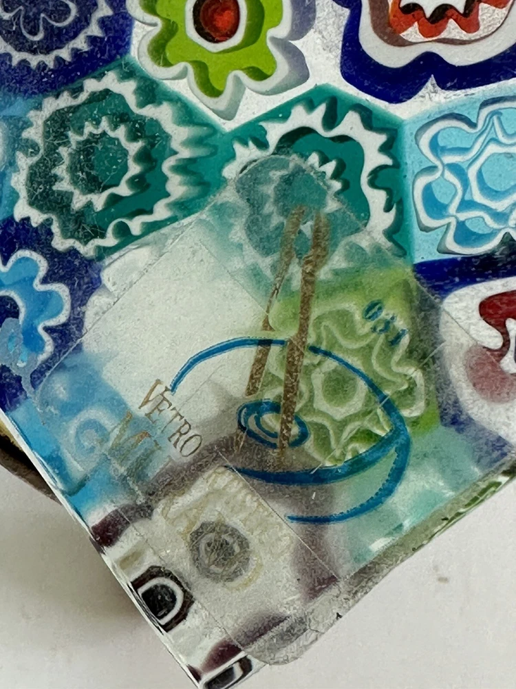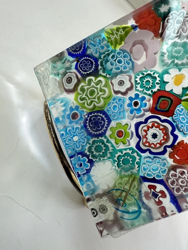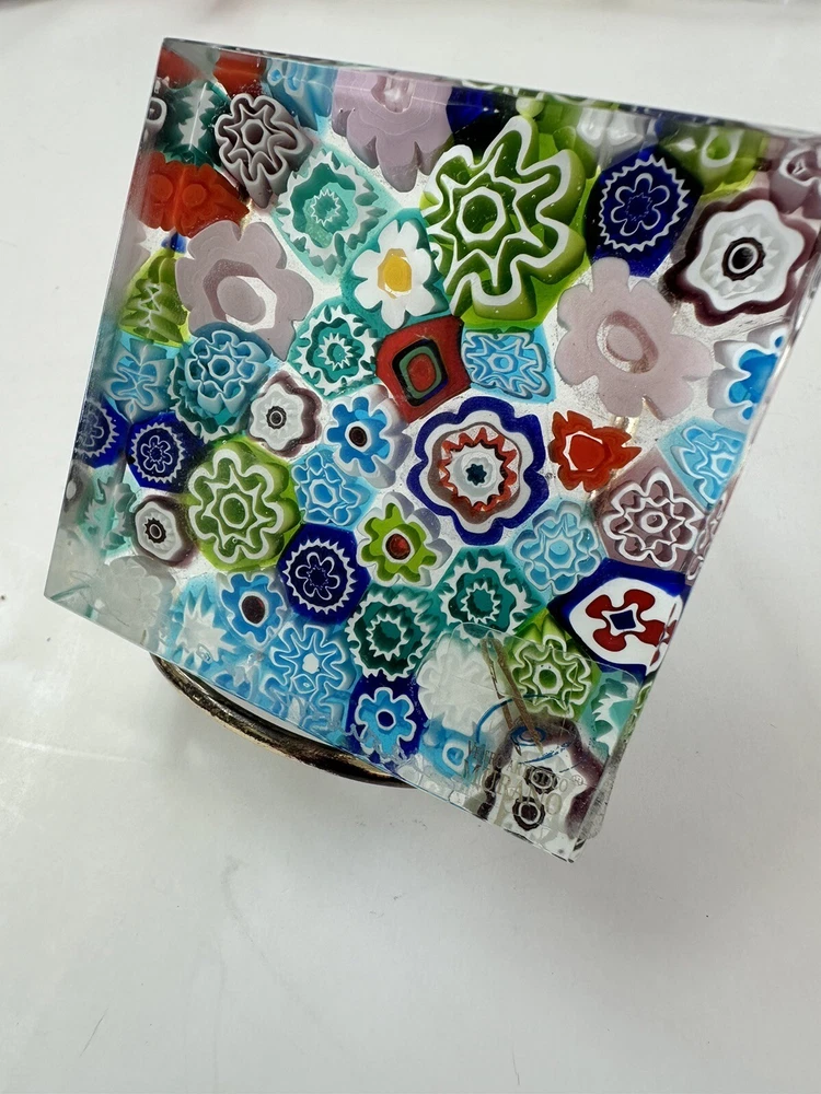 This beautiful paperweight is a stunning piece of Murano glass art. Hand blown in Italy, it features a intricate floral pattern in a variety of vibrant colors. The piece measures 2.75 inches in both length and width, making it a perfect addition to any collection. With its traditional style and production technique of millefiori, this paperweight is a true work of art. The label of Vetro Artistico Murano is still attached and its signed Si Siosi Murano ,adding to its authenticity and value. This item is perfect for anyone who appreciates the beauty of glass art and wants to add a unique piece to their collection. Makers Mark: Hand inscribed to edge of the top surface, "Si Siasi Murano" and it still retains the original label, "Vitro Artistico Murano". An excellent modern design. A colorful block with close packed millefiori ground of orangey-red, blue, white, & green and pink floral canes.