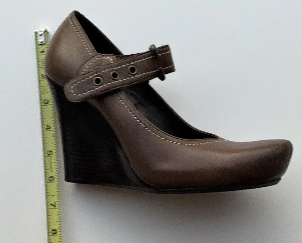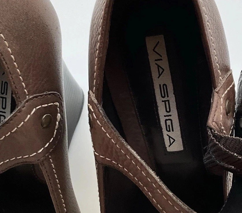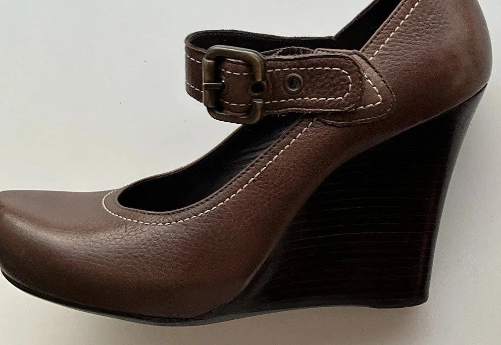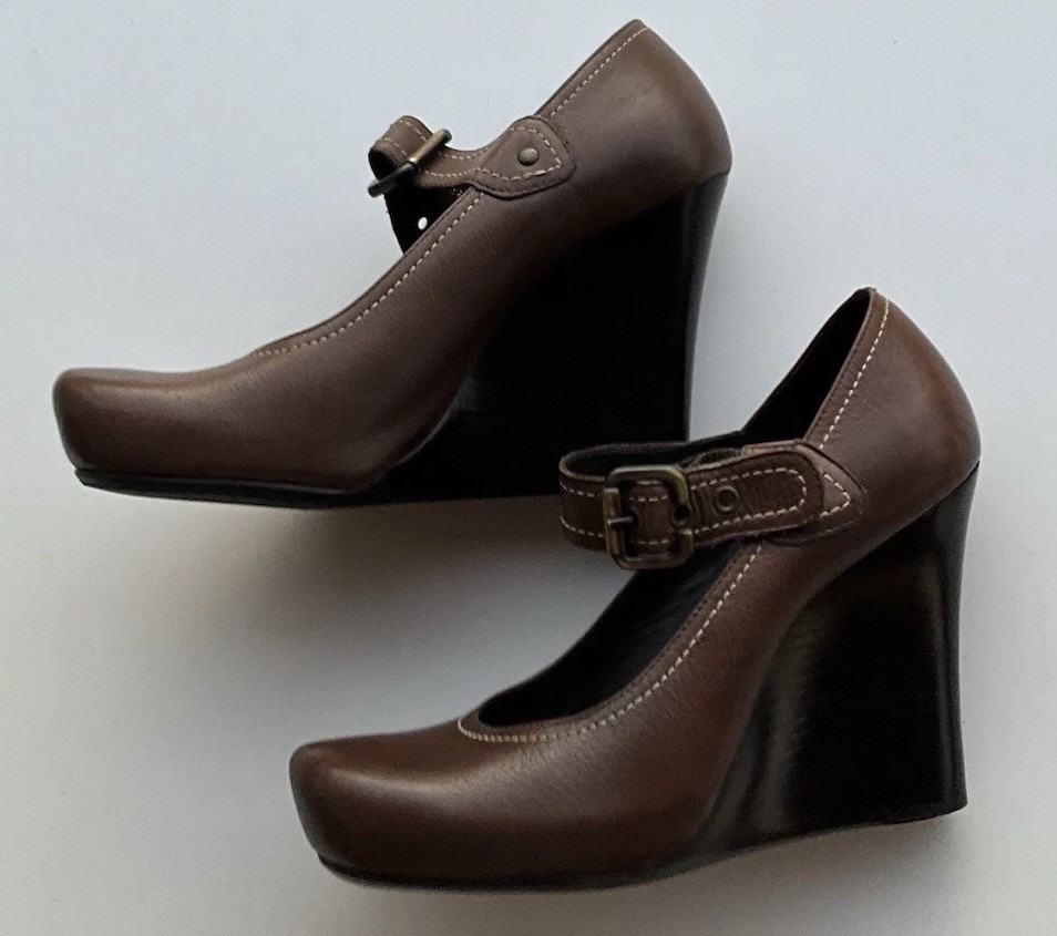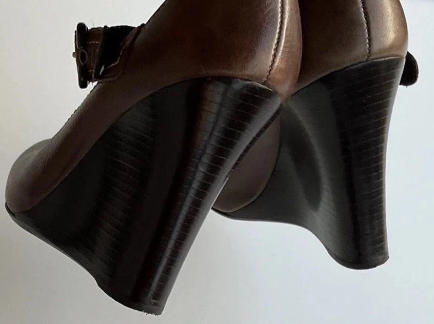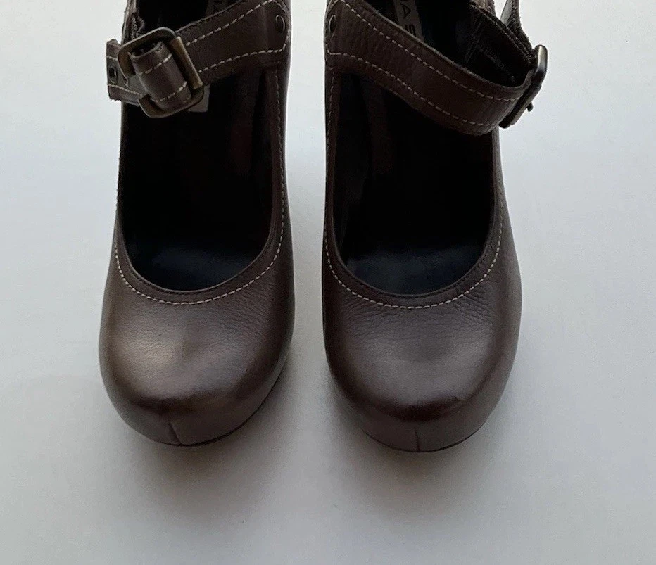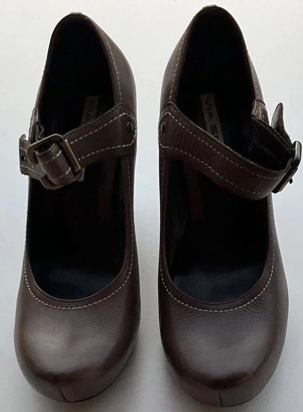 Accents: Strap Toe Shape: Round Toe Type: Heel Heel Style: Block Department: Women Theme: City, Cowboy, Cowgirl, Going Out, Victorian, USA, Transportation, Wedding, Snake, Punk, Outdoor Occasion: Casual, Party/Cocktail, Workwear, Wedding, Travel, Formal, Business, Activewear, Christening Character: Leather Vintage: Yes Upper Material: Leather Brand: Via Spiga US Shoe Size: 5.5 Style: Pump Features: Straps Closure: Buckle Season: Summer, Spring, Fall, Winter Heel Height: High (3-3.9 in) Color: Brown