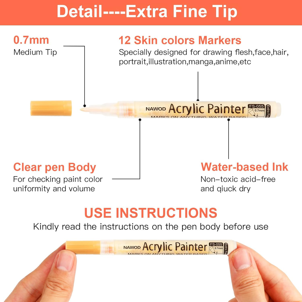 Store New Arrivals Add to Favorite View Feedback NAWOD Skin Tones Art Markers, Acrylic Paint Pens Set of 12 Skin Colors Paint Markers for Rocks Canvas Tiles Glass Ceramic Wood Sketch Portrait Manga Drawing Illustration Sketching, Extra Fine Tip Description Item model number SHENZHEN XMPEN FACTORY STATIONERY Item Weight 4 ounces Number of Items 12 Color 12 Skin Tones Material Type Plastic Brand NAWOD Line Size 0.7mm Manufacturer Part Number SHENZHEN XMPEN FACTORY STATIONERY Ink Color 12 Skin Tones Recommended Uses For Product Ceramic,Drawing,Illustration Manufacturer NAWODART007 Point Type Extra Fine Product Dimensions 5.9 x 0.6 x 0.6 inches Size 1 Count (Pack of 12) Premium Quality Acrylic Paint Pens: NAWOD Acrylic paint pens are made with high quality abundant oil ink, High purity color, strong covering force, waterproof, fade proof, non-bleeding. non-toxic, no odor, no strong smell, write smoothly and no leak. 12 Skin-tone Colors Marker Pens: This set has 12 skin portrait colors ranging from light to dark shades, specially designed for flesh & face drawing, bodies, hair, manga, portrait painting, illustration, sketching, and other artistic creations. Multi-Purpose: Enjoy creating art projects on a variety of surfaces like tiles, rocks, canvas, glass, wood, metal, fabric, porcelain, plastic, cardboard, papers, Halloween Pumpkin Painting, Christmas ornament, and much more for both smooth and porous surfaces; 0.7mm extra fine tips for fine line work, detailed DIY projects or art. Quick Drying & Non-toxic: Acrylic paint markers dry fast to help avoid blotches and smudging. Every marker is non-toxic with the safety standard ASTM D4236 & EN71-3 and safe for children from 3-year-old. Easy to Mix, No Stains: forget spots and uneven coloring. Our High-quality inks are seamlessly mixed to achieve beautiful coloring effects, even for newbies. In addition, your artwork will never fade or stain over time. Product Description HOW DO I USE IT? In order to get the best results, it is important that the following instructions are followed. 1. With cap on, shake well to mix paint. When you hear the ball rattle inside, you’ll know the paint is mixing. 2. Press the tip to release the air. Then press the tip several times vertically until the ink exudates. 3. Test on paper before use. Then enjoy painting on different surfaces. If the nib dries out, you can press it again. 4. Recommended to cover the pen cap in time when not in use to prevent it from drying out.Better protection of the tip to extend the service life. NOTE: 1. Different materials have different drying times and different coloring conditions. You can wait for a while after writing to ensure better drying.Let it dry for a day for permanent results. 2. For a permanent result on the glass, porcelain, and ceramics, projects should be baked. Suggest bake for 1 hour 350F(180C). 3. Sharp rubbing will cause loss of color, you can use the pen to make up for color again. 4. Pay attention to hand contact when writing. After staining, please clean your hands as soon as possible. ABOUT US We offer the best prices around on high quality products. Our E-store includes media such as books, movies, music and games while offering electronics, toys, sporting apparel, clothing, tools, general home, garden items and more. SHIPPING We are always working hard to ensure your package arrives as soon as possible. Please understand that some factors like weather, high postal traffic, and the performance of shipping companies are outside of our control. We offer free shipping to the lower 48 states and ship within 2 business days of payment, usually sooner. We do not accept P.O. Boxes. Please provide a physical address. RETURNS We offer a 30-Day Return Policy on items which you are not completely satisfied with. You have the option for a full-refund or an exchange of the item. No returns are available on items shipped outside of the USA. PAYMENT We accept PayPal. CONTACT US This page content is yet to come Please ad us to your favorite seller and visit again later Thank You