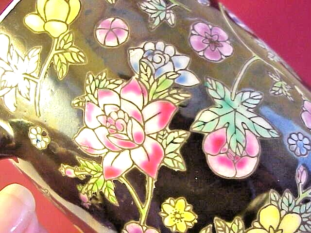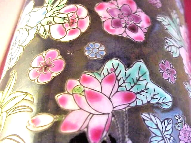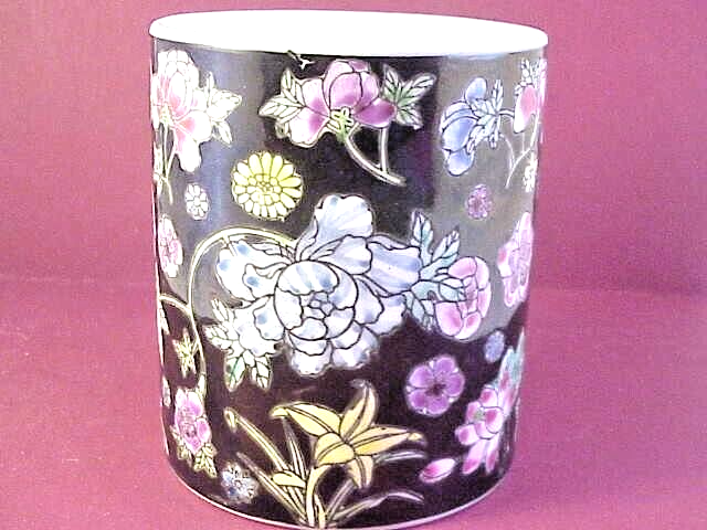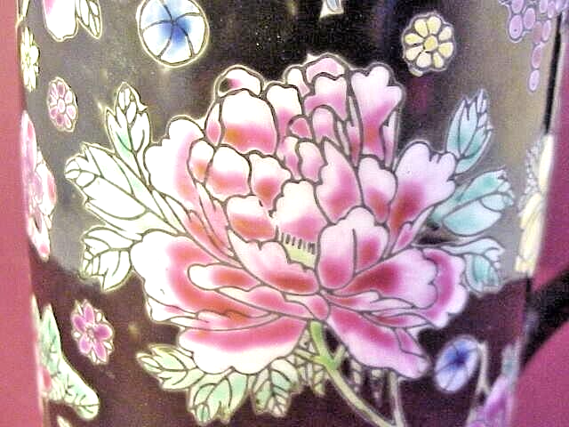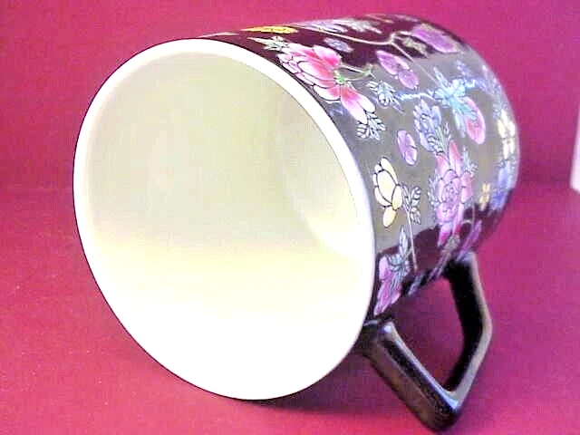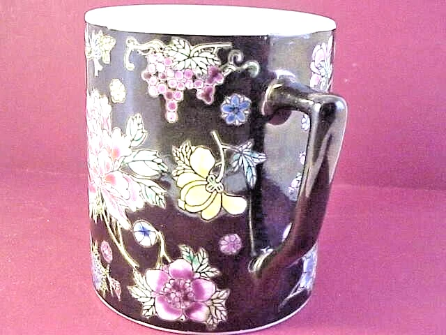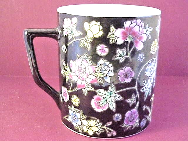 Coffee Cup With Variety of Beautiful Flowers on Black Background - measures 4" high - inside measurement is just under 3 1/2" - marked on bottom China - 08. In good condition with no chips or cracks. See photos - Shipped with USPS First Class Mail