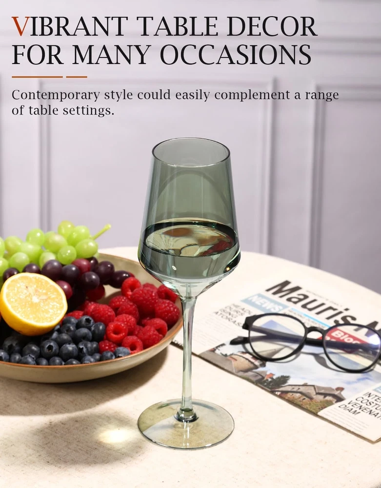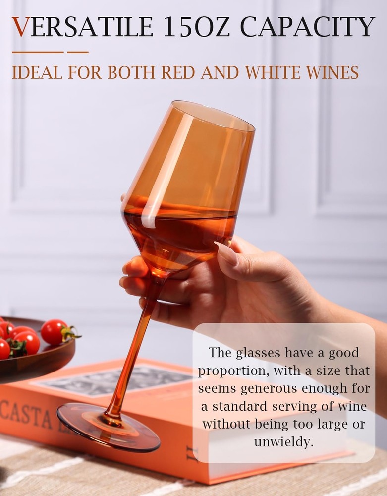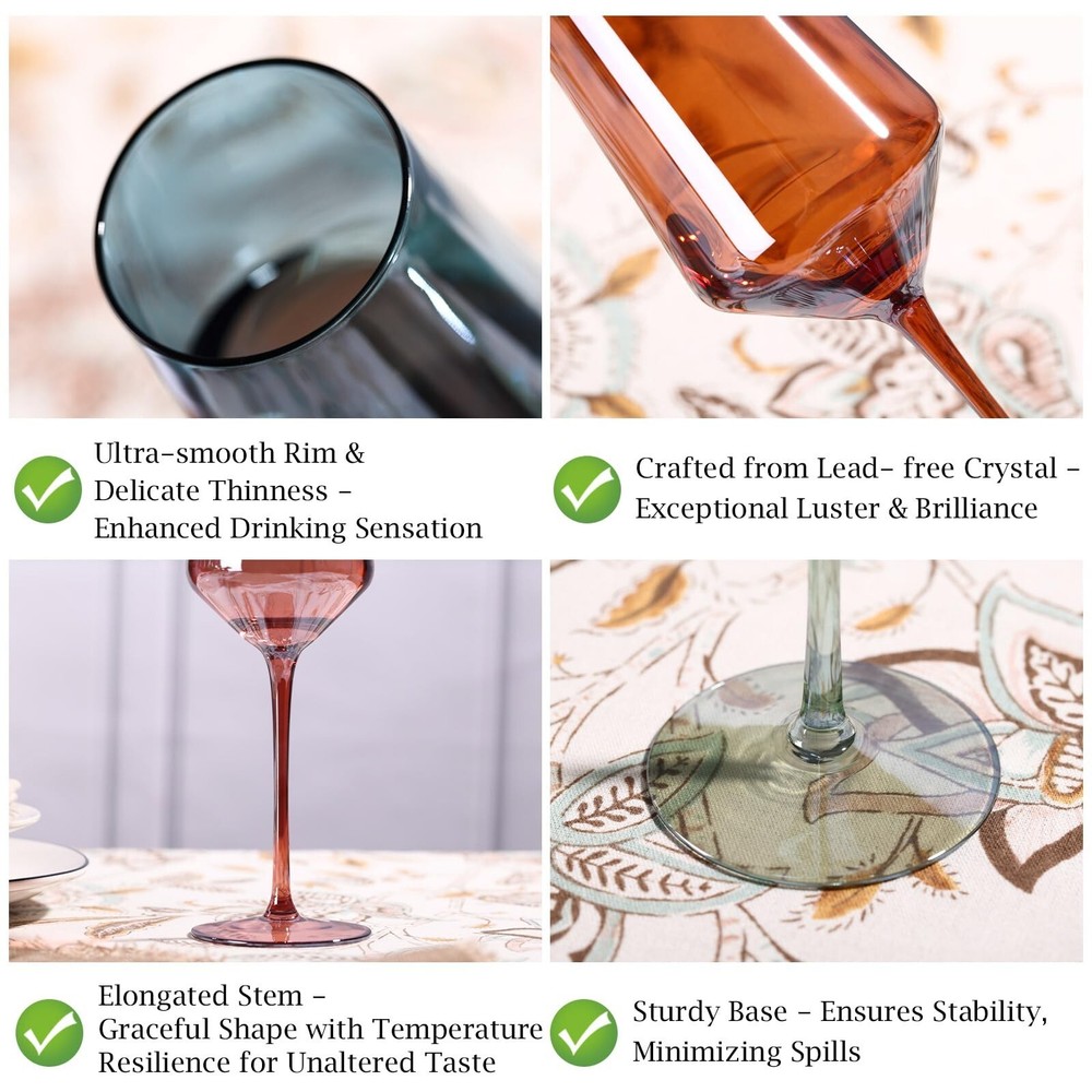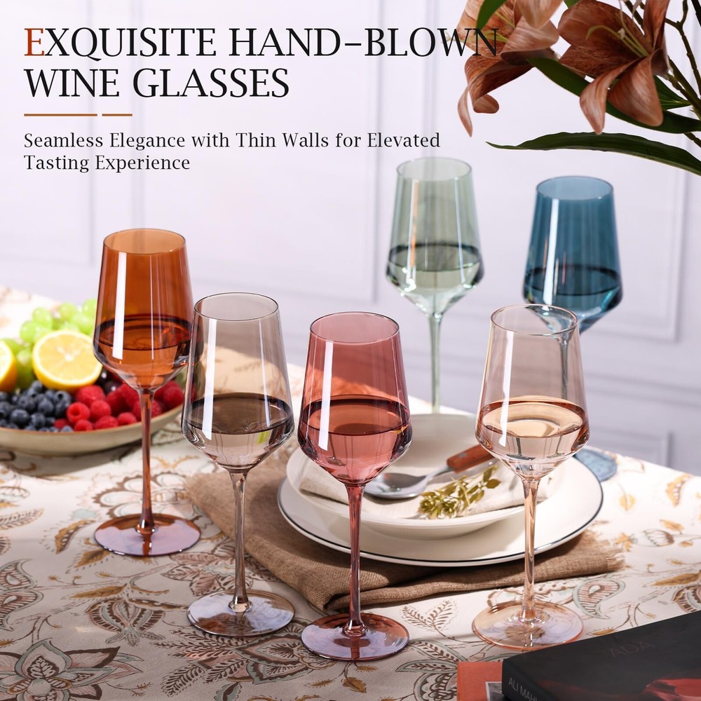Colored Wine Glasses Set of 6-15 oz, Unfading Color, Hand-blown Wine Glasses - Gifts for Wine Lovers, Christmas Gifts for Women Product Details Color: Multicolor Brand: comfit MPN: Does not apply UPC: Does not apply EAN: Does not apply Brand: comfit Color: Multicolor Special Feature: Hand-Blown Luxury Crystal Wine Glasses Set Style: Modern Theme: Engagement, Christmas, Wedding, Birthday, Valentine's Day Brand: comfit Color: Multicolor Special Feature: Hand-Blown Luxury Crystal Wine Glasses Set Style: Modern Theme: Engagement, Christmas, Wedding, Birthday, Valentine's Day Recommended Uses For Product: Home Included Components: 6 wine glasses Specific Uses For Product: Red & White Wine Shape: Round Pattern: Solid Product Care Instructions: Hand Wash Only Age Range (Description): Adult Material Feature: Lead-Free Reusability: Reusable Unit Count: 6.0 Count Product Dimensions: 5.3"W x 9.8"H Material Type Free: Lead Free Number of Items: 6 Embellishment: Crystals Item Weight: 2.5 pounds Date First Available: August 29, 2023 6-Color Wine Glasses: Available in six vibrant colors, these wine glasses are perfect for gatherings, allowing each guest to easily distinguish their glass Thin Rim, Long Stem: These hand-blown wine glasses feature a thin rim for a refined sip and an elegant long stem for a comfortable hold. With a 15-ounce capacity and a well-balanced design, they enhance the wines flavor while being durable enough for everyday use Handcrafted Elegance: Each hand-blown glass features a delicate, thin rim that enhances the smoothness of each sip and intensifies the wine's aroma and flavor. The artisanal craftsmanship ensures that each glass is unique and treasured, adding sophistication and a touch of exclusivity to your drinking experience Perfect for Gifting: These colorful wine glasses make an ideal gift for birthdays, weddings, or housewarmings. Their vibrant design adds a touch of elegance and personality to any occasion, making them a memorable and cherished present Dedicated Customer Support: If you encounter any issues with your purchase, please contact us. We are committed to resolving any problems and ensuring your complete satisfaction