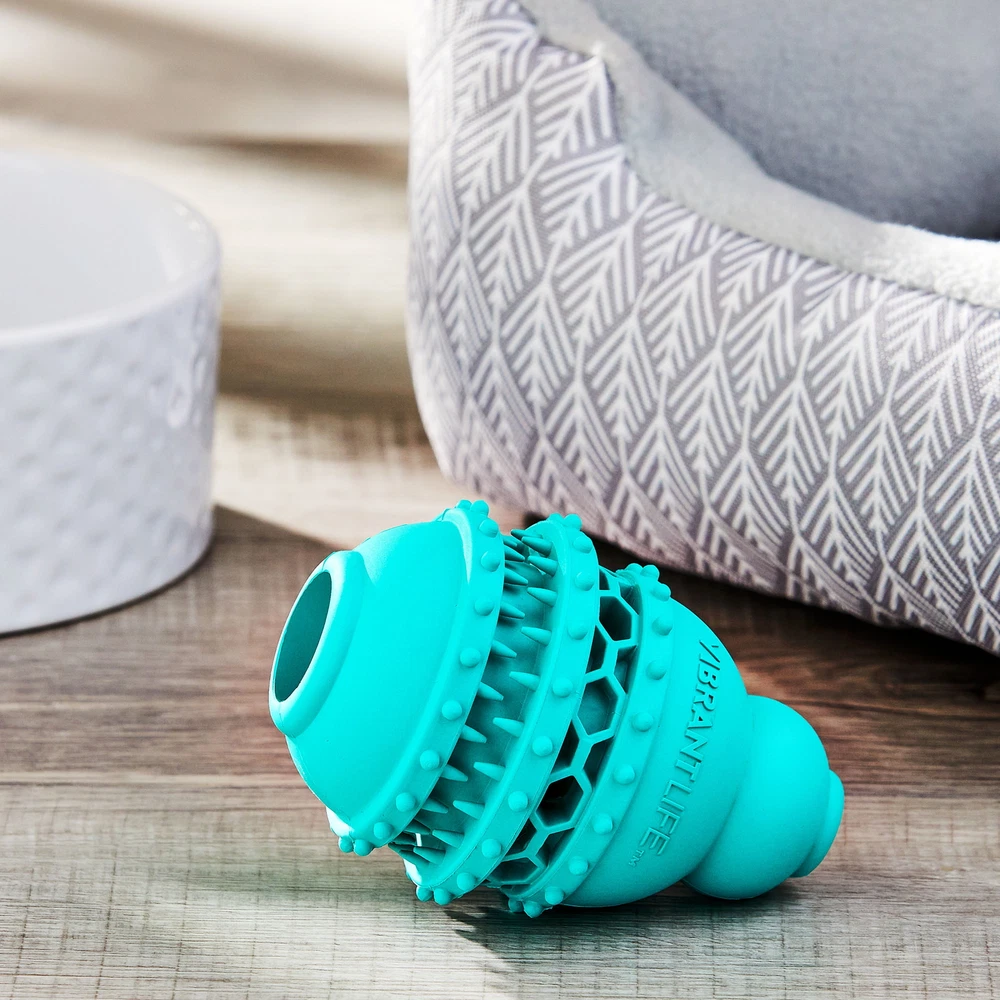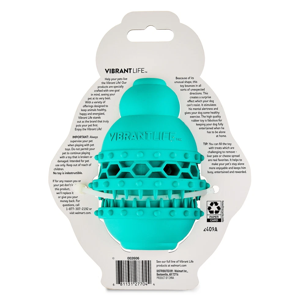 Delight your dog with our Vibrant Life Treat Buddy Dog Toy, designed not just for fun, but also to engage your pet's mental acuity. The toy's unique shape ensures it bounces in unexpected directions, introducing an element of surprise that your dog will find irresistible. It's a fantastic way to keep your dog entertained and mentally stimulated while you're busy with tasks like cooking, cleaning, or working. Constructed from durable, food-safe rubber, the toy doubles as a safe chewing option for your pet. It's available in three different sizes, ensuring an ideal fit for your furry friend. But the real fun comes when you fill this toy with your dog's favorite treats or smear it with peanut butter or other tasty, dog-safe spreads. As your pet enjoys extracting the treats, they're also satisfying their natural urge to chew and play. Keep your dog happy and engaged with our Vibrant Life Treat Buddy Dog Toy. Vibrant Life Treat Buddy Dog Toy, Chew Level 5, Medium Long-lasting treat-dispensing chew toy Provides fun, stimulating play for your dog Hollow interior is perfect for stuffing with treats, peanut butter, or cheese spread Suitable for indoor and outdoor play Made from durable food-safe rubber Ideal for medium-sized dog breeds to play with and carry around Chew level 5: Heavy chewing Check out the entire vibrant life collection for more pet accessories like collars, leashes, dog-feeding dishes, and toys Styles may vary