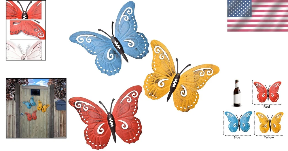 Vibrant Metal Butterfly Wall Art Decor Set - Rainbow Colors 3 Pack 9.4" L x 7.5" H ‹ › ‹ › ‹ › ‹ › ‹ › ‹ › ‹ › ‹ › ‹ › Vibrant Metal Butterfly Wall Art Decor Set -Rainbow Colors 3 Pack 9.4" L x 7.5" H Features: Set of 3 colorful metal butterfly wall art decors Hollow-carved 3D shape design and rainbow painting Measuring 9.4" L x 7.5" H Craft painting with bright colors High grade metal construction Keyhole wall-mounted hanger for easy display Benefits: Enlivens your space with vibrant colors Adds texture and depth to your surroundings Complements any decor style Durable construction for years of use Can be used indoors or outdoors Easy to hang and display Why choose our Vibrant Metal Butterfly Wall Art Decor Set? Transform your space with our colorful metal butterfly wall art decor set. With its 3D shape design and rainbow painting, these butterflies will bring life to your walls, fence, garden, or home. Made of high-grade metal, these wall decors are durable and lifelike, adding a refreshing feel of nature to any room. Whether you want to add a splash of color to your living room, bedroom, porch, patio, or garden, our metal butterfly wall art is the perfect choice. Easy to hang and display, these butterflies will instantly enhance the look of your space and provide years of use. Don't miss out on this beautiful and versatile wall decor set - order your Vibrant Metal Butterfly Wall Art Decor Set today! Shipping Free & Fast Shipping - We offer free shipping to most of the USA with a normal delivery time of 3-7 days. However, due to the current situation, additional delivery time (up to 3 weeks) may be required for some items. Alternative Carriers - We may use alternative carriers (e.g. USPS, FedEx, UPS, etc.) to ensure your package arrives safely and on time. Due to the use of multiple carriers, we are unable to provide a tracking number automatically. Handling Time - Orders are processed and shipped within 1-2 business days of receiving cleared payment. Shipping Restrictions - Shipping to Alaska, Hawaii, Puerto Rico, Guam, and other US territories may incur shipping charges or delivery restrictions. Please contact us before ordering, or your order can be refunded/cancelled. State Restrictions - There may be restrictions based on your state of purchase. For example, certain items may not be shipped to California due to state regulations. Contact for Tracking Updates - If you require tracking updates or have any concerns about the delivery of your order, please feel free to contact us, and we will be happy to assist you. Return 30-Day Hassle-Free Returns - We want you to be completely satisfied with your purchase. If you are not, you can return the item within 30 days of receiving it for a full refund or exchange. Easy Return Process - To start a return, simply contact us and we will provide you with a prepaid return shipping label and detailed instructions. Restocking Fee - There are no restocking fees for returns. However, the buyer is responsible for return shipping costs if the return is not due to a seller's error. Refund Processing Time - Refunds will be processed within 5 business days of receiving the returned item in its original condition. Payment We accept all major credit cards, PayPal, and Apple Pay for your convenience. Your payment information is secure and encrypted to ensure a safe and seamless transaction. Please complete your payment within 3 days of purchase to avoid any delays in shipping. Feedback Your feedback is extremely important to us. We strive to provide the best products and customer service possible. If you are satisfied with your purchase, please take a moment to leave us a positive review. If you have any concerns or issues with your order, please contact us before leaving negative feedback. We are committed to resolving any problems and ensuring your satisfaction. Contact Us If you have any questions or concerns, please feel free to reach out to our customer support team. You can contact us through the eBay messaging system. We are available Monday to Friday, 9:00 am to 5:00 pm EST, and we will do our best to respond to your inquiry within 24 hours. Thank you for supporting our small family business!