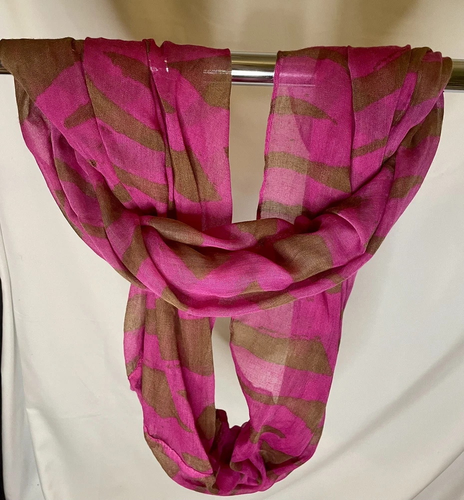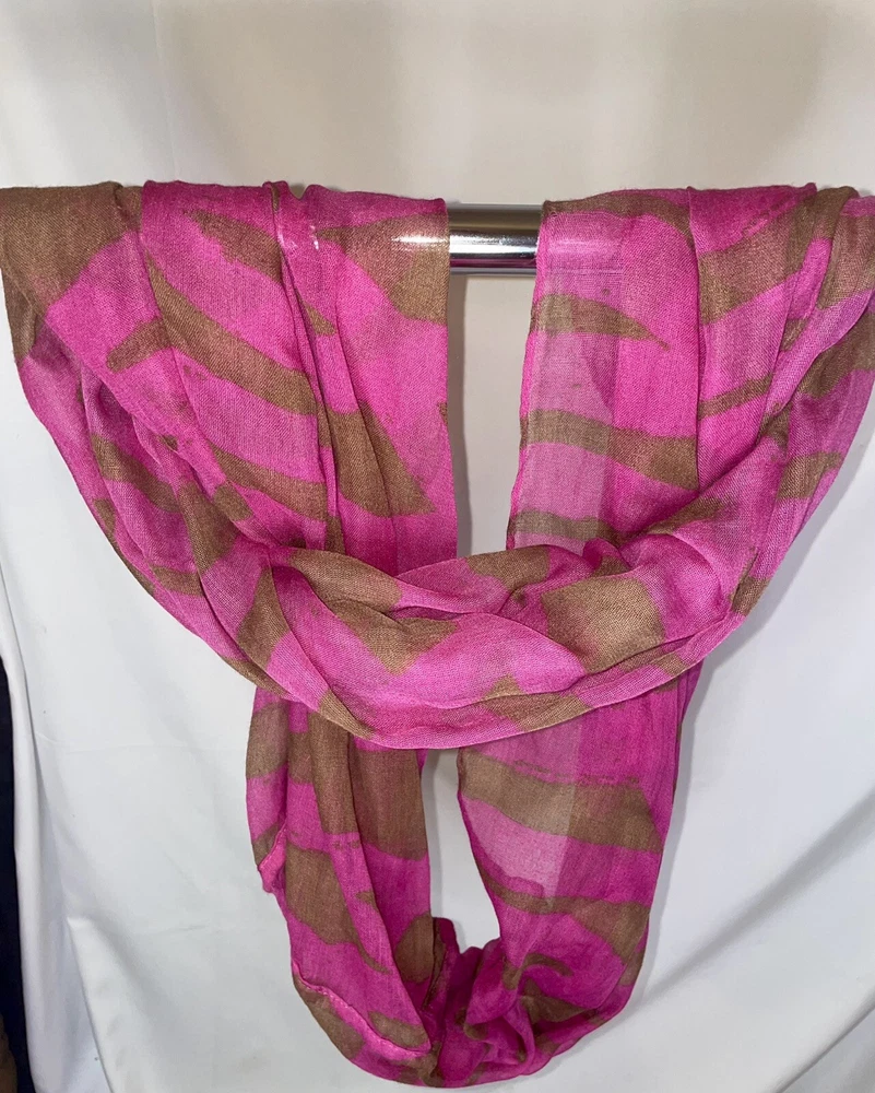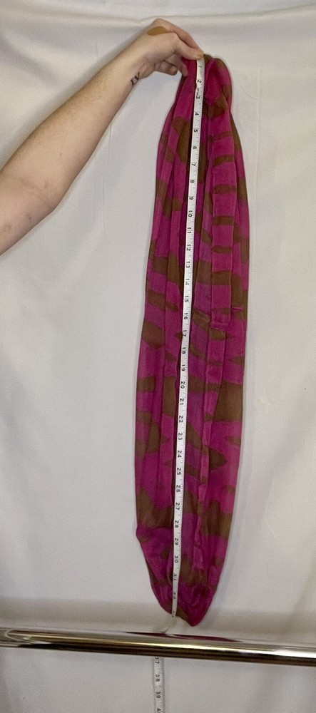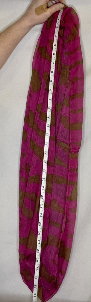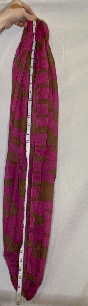 Description: Add a pop of color to your outfit with this gorgeous pink and brown striped infinity scarf. Perfect for layering during all seasons, this lightweight scarf combines comfort and style effortlessly. • Style: Infinity scarf • Color: Pink with brown stripes • Material: Soft and breathable fabric (feels like chiffon or lightweight polyester) • Length (circumference): Approximately 62 inches • Condition: Pre-owned in excellent condition with no visible tears or stains. Only used once! This scarf is perfect for casual wear, travel, or accessorizing your outfits with a bold, vibrant look.