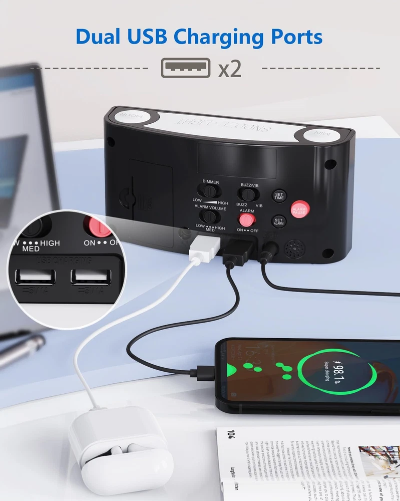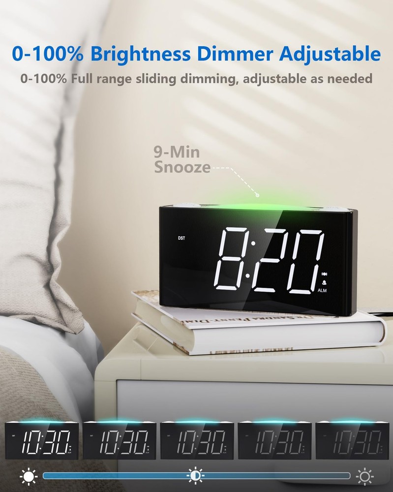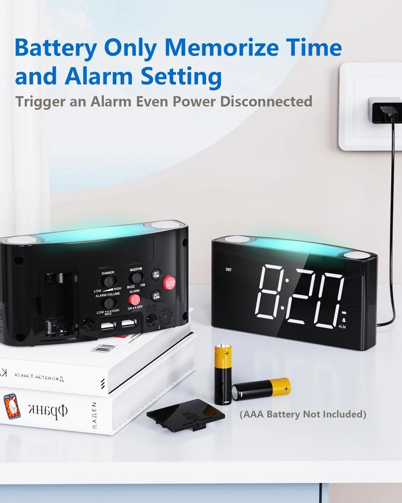 Heavy Sleeper Alarm Clock – Features bed shaker + buzzer with 3 wake-up modes (sound/vibration/both). Ideal for deep sleepers & hearing impaired. 7-Color Night Light & 7" LED – Customizable lighting + snooze function. Large display with adjustable brightness. Easy Setup & Smart Features – One-touch controls, 12/24H time, DST adjustment. Dual USB Charging + Battery Backup – Charge 2 devices. Works during outages (AAA batteries not included). 【Bed Shaker & Buzzer Wakeup】This alarm clock for heavy sleepers, hearing impaired seniors is designed with a vibrating bed shaker and the buzzer can wake people up in 3 ways to personal preference. You can choose the alarm to be a buzzer, a pillow vibrator without disturbing your family or both by sliding the switch left or right, or middle for both. It has 3 levels of volume control which are low, medium and high, meeting different demands. 【7 Color Night Light & Large 7'' LED Screen with Full Range Dimmer】The bedroom LED digital alarm clock for adults and kids has 7 color night lights which allows you to choose your favorite one, definitely a great gift choice. The night light button also works as SNOOZE to get an extra 9 min when clock rings. Easy to read across the room with the large 7'' LED display and full range brightness dimmer for poor eyesight or people used to the dark sleeping environment. 【Super Easy Operation,12/24H Time Format & DST】The Digital Alarm Clock with simple & intuitive buttons and easily set without annoying hold or repeat press.1-minute finish setting, your boys girls and parents can operate it easily. Press and hold the Hour button to change the 12H or 24H time format. DST function is essential to the electric alarm clock. Hold and press SET TIME to easily activate or deactivate the Daylight Saving Time function and add or minus 1 hour on your display. 【Dual USB Chargers】The vibrating alarm clock for deaf with dual 5V/1A USB charging ports on the back enables you to charge 2 devices at the same time. This function helps when no more outlet for devices on your nightstand and saves your time. 【Battery Backup】This alarm clock with bed shaker can put into 2pcs AAA batteries (not included) to back up your time setting and ensure the alarm keeps working in case of power failure(battery doesn't support time display but can trigger the alarm)