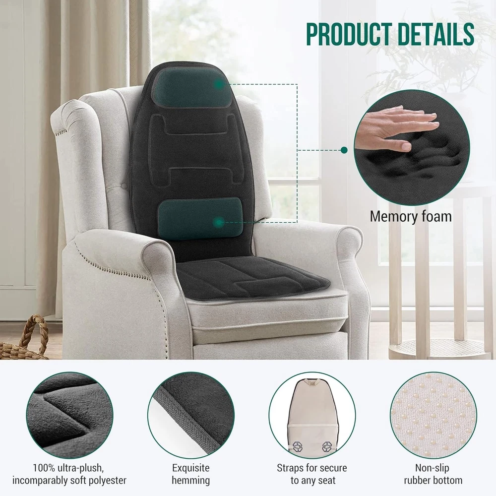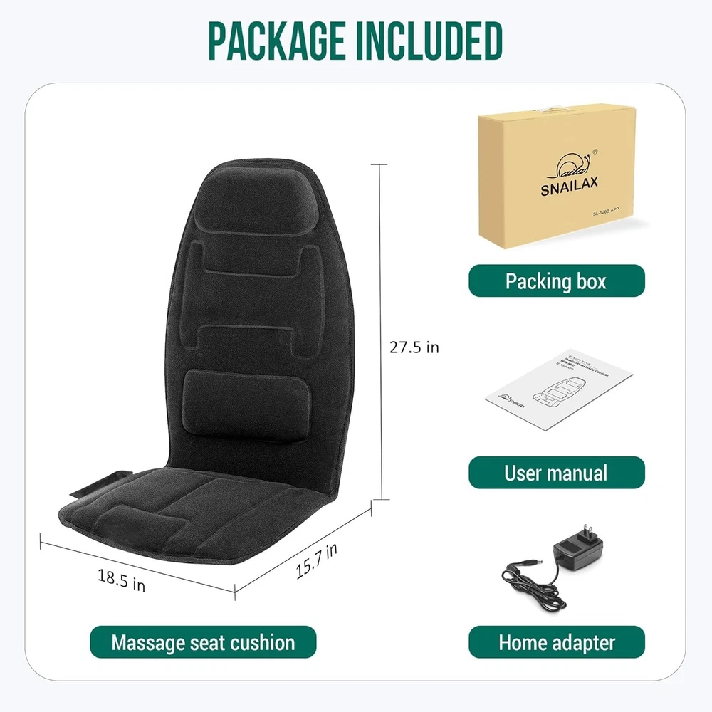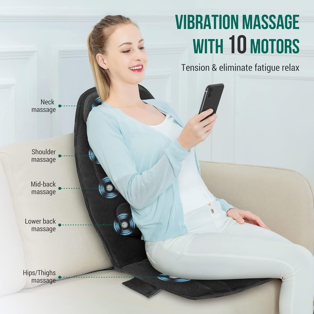 Vibration Back Massager with Heat, APP Control, Massage Seat Cushion with Extra Memory Foam Support Pad in Neck and Lumbar, 10 Vibration Massage Motors, 2 Heat Levels, Gifts Note: This is only a VIBRATION massager, not a Shiatsu Kneading massager. Do not buy this vibration back massage pad if you are looking for a shiatsu massager with rolling balls. Smart Application: This massage chair pad can connect "" APP to start a new smart healthy life and easily by operating your smart mobile . The default setting is 15 minutes to complete a cycle. It is recommended to use this massager up to 3 cycles a day only. Vibration Massage -The back massager with 10 powerful vibrating motors (8 spot for back and 2 for thighs ) and heat function, provides soothing gentle massage for back,thighs to help relieve muscle stress,tension. A PERFECT GIFT for Mothers day, Fathers day or birthday gift Christmas gift for your loved ones. Fast Heating & Safe - The seat warmer has 2 heat levels for full back and seat area, provides heat for back and hips, thighs. The back heater and seat heater can work separately. Fast heat-up, overheating protection system and 30-minute auto shut-off for safe use. Soft Plush Fabric & Non-Slip - This seat cushion cover is made of 100% ultra cozy plush, soft polyester that offers a comfortable and great feeling for body touch. Non-Slip rubber bottom, STAYS IN PLACE: Dual adjustable strap goes around back of chair seat to keep cushion stable and secure. Heated Vibration Back Massager With App Control