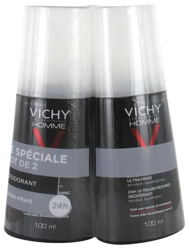Vichy Homme Ultra-Fresh 24H Deodorant Spray Pack of 2 x 100 ml is an ultra-fresh deodorant spray for men who want to keep the underarms fresh and odor-free continuously. It is specially dedicated to sensitive skin. It is formulated with deodorant and antibacterial active ingredients for ultra-fresh 24-hour anti-odor effectiveness without white marks on your skin. Hypoallergenic. Dermatologically tested. Made in France. USING ADVICEApply morning and/or evening under the armpits. Avoid spraying on irritated skin or towards the eyes; if splashed, rinse immediately with plenty of water. Indication: Sensitive skin. COMPOSITION Alcohol Denat., Aqua/Water, Parfum/Fragrance, Dipropylene Glycol, Lactic Acid, Triethanolamine, Zinc Ricinoleate. • Economy Shipping: No tracking (11–23 business days) • Standard Shipping: With tracking (5–10 business days) • Buy 2 or more: Automatically upgraded to Standard Shipping