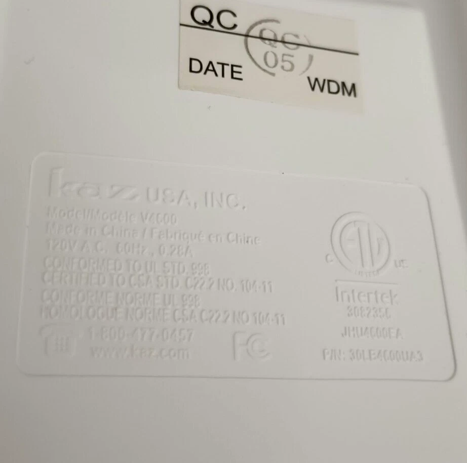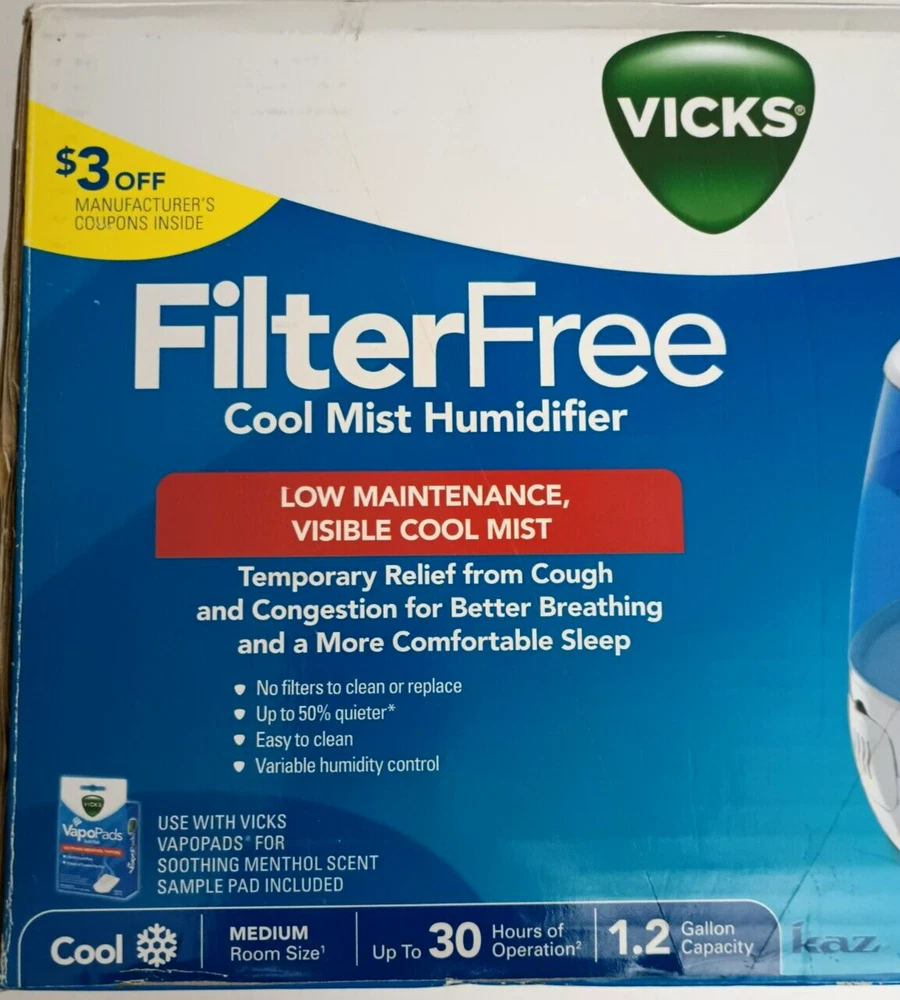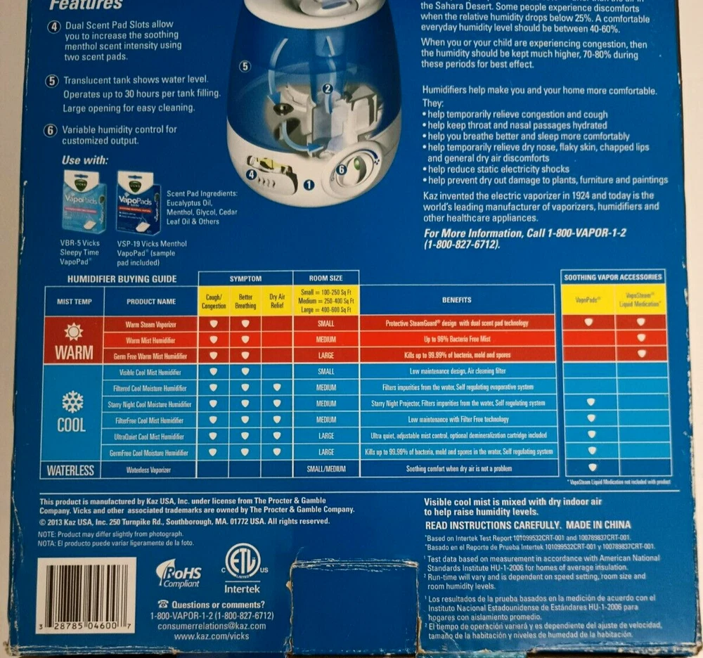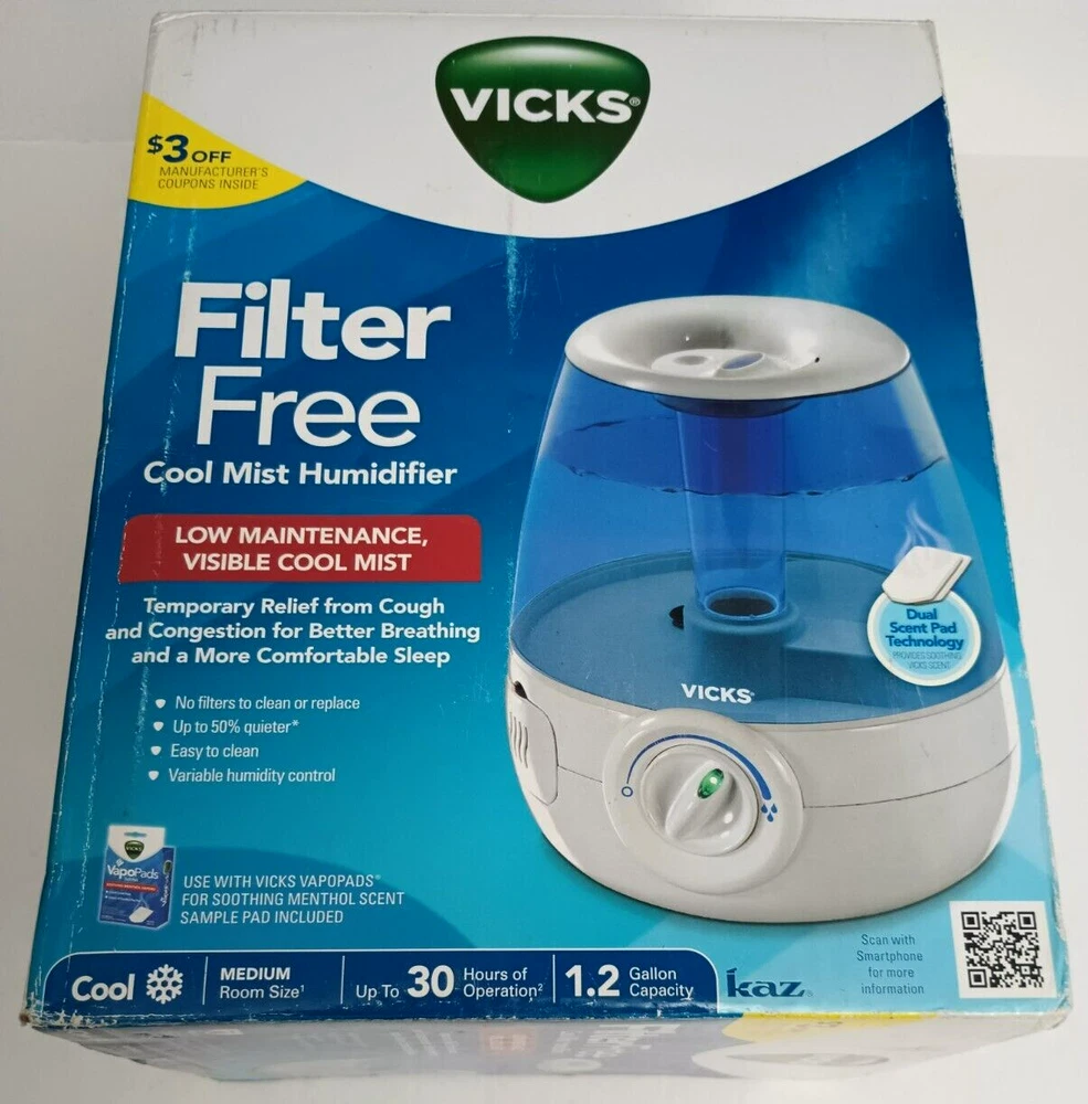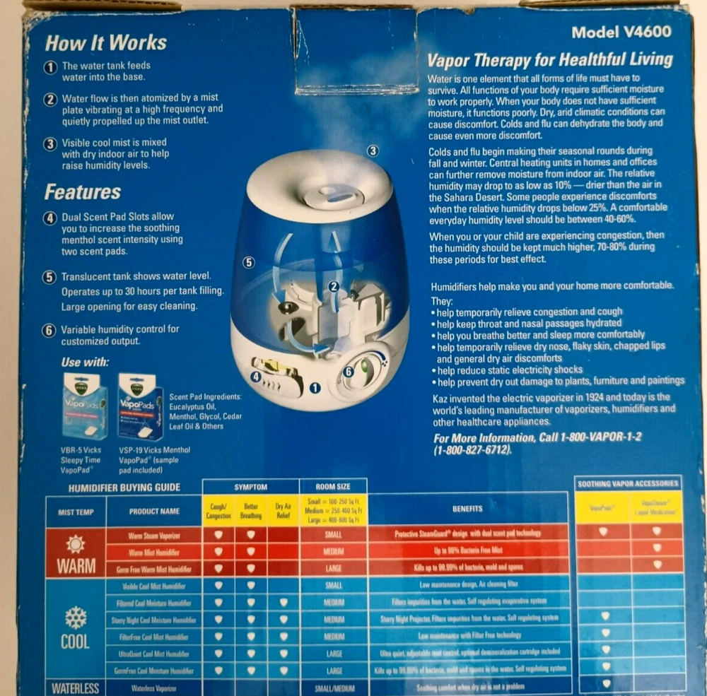 Model: Vicks V4600 UPC: 0328785046007 Voltage: 120 V Application: Medium Room Type: Tabletop Humidification Method: Cool Mist Features: Adjustable Humidity Control, Aroma Diffuser, Portable, Quiet Operation, Wired gtin13: 0328785046007 Color: Blue, White MPN: V4600 Brand: Vicks Tank Capacity: 1.2 gal.