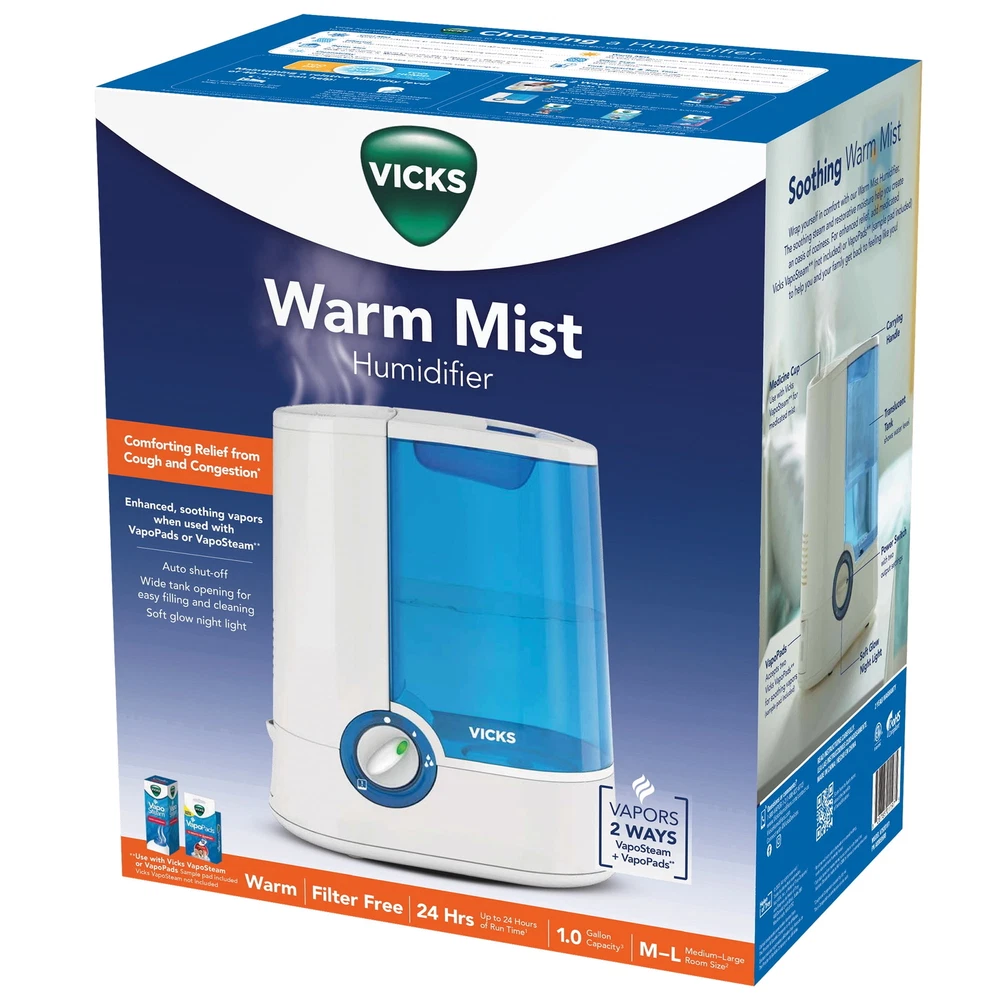 Improve the air quality of your home and get soothing relief with the Vicks Warm Moisture Humidifier, V750. This product is an integrated scent pad heater intended to be used with Vicks Vapor-Pads and in rooms up to 400 square feet. The Vicks Moisture Humidifier releases visible vapor to help temporarily relieve cough and congestion. It's easy to operate and works quietly and without a filter. Vicks V750 features two different output options, an automatic shutoff function and a 1-gallon tank that's easy to fill and empty. It includes a medicine cup for adding liquid inhalant products such as Vicks Vapo Steam and Kaz Inhalant. The Vicks Warm Moisture Humidifier, V745D is ideal for dry air conditions, during allergy season, or when sick. Integrated scent pad heater for use with Vicks Vapo Pads Medicine cup for use with liquid inhalants such as Vicks Vapo-Steam or Kaz Inhalant Vicks Moisture Humidifier has 2 output settings; Filter-free operation; Auto shut off when empty; Tank handle for easy carrying and filling; Quiet operation; The warm mist humidifier has a 1-gallon tank capacity; Runs up to 24 hours per filling; Large tank opening for easy cleaning; Removable dishwasher-safe parts; Vicks V745D releases visible vapor to help temporarily relieve cough and congestion; Ideal for dry air conditions, during allergy season or when sick Features Automatic Shut-Off Brand Vicks Manufacturer Part Number V750D1V1 Assembled Product Weight 4.9 lb Assembled Product Dimensions (L x W x H) 8.60 x 12.00 x 14.50 Inches