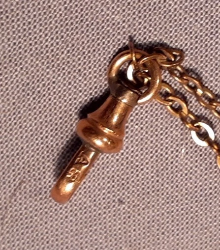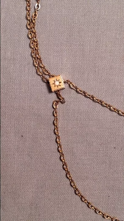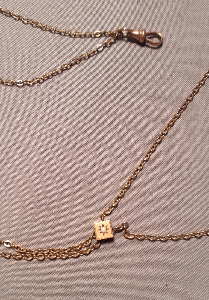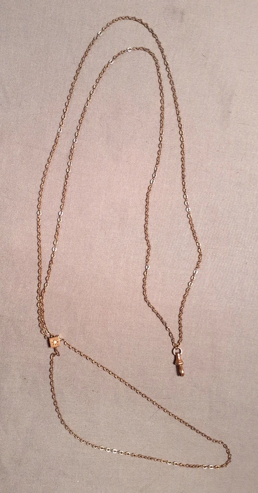 A Victorian ladies watch fob chain with opal slide in very good used condition. It is signed on the hook with an "A" and another symbol. See picture. The chain is 24 inches long. See many photos for complete description and condition.