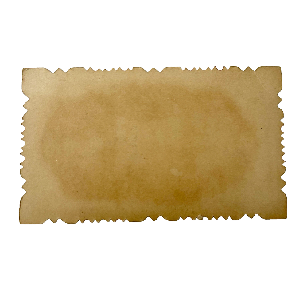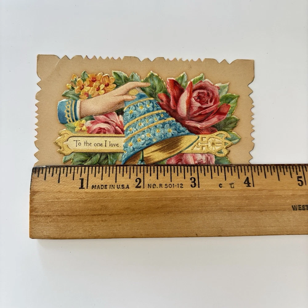 This image is a vintage die-cut card, a Victorian calling card from the 19th century, featuring a detailed illustration. * Size: 4”w x 2-1/“h * Condition: Great pre-owned, antique condition, with a little wear. See images for more details.