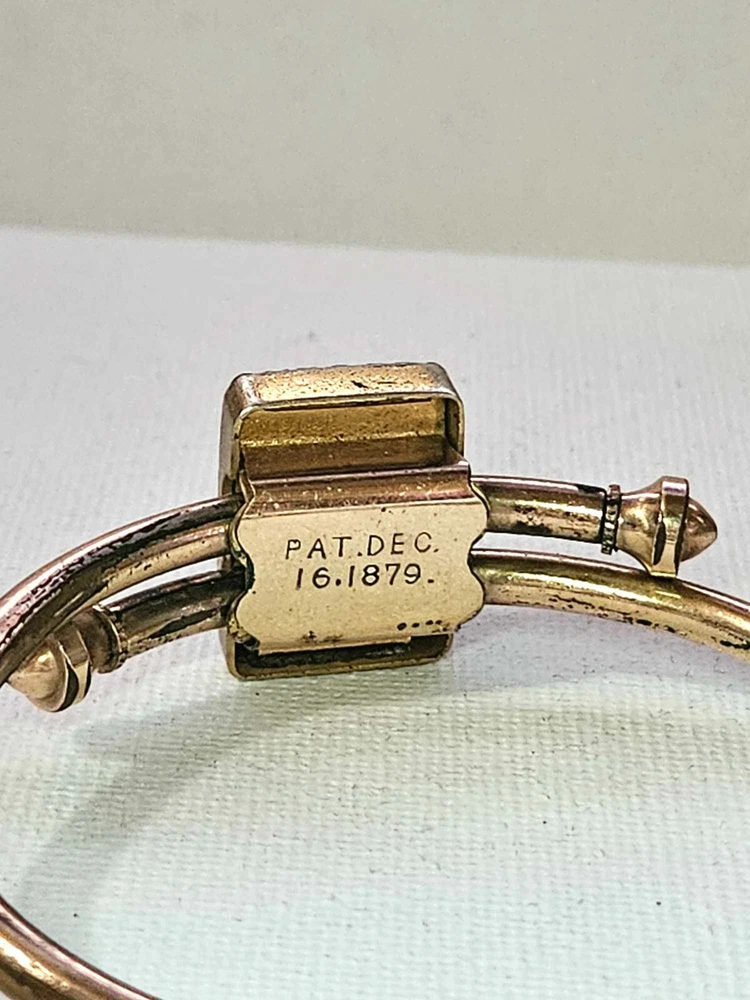 Antique Victorian Hinged Cuff Bracelet Stamped Dec. 16.1879 Gold P Please look at all photos Some normal wear considering age Feel free to Google Lens my images to find Comps. Thanks for looking!