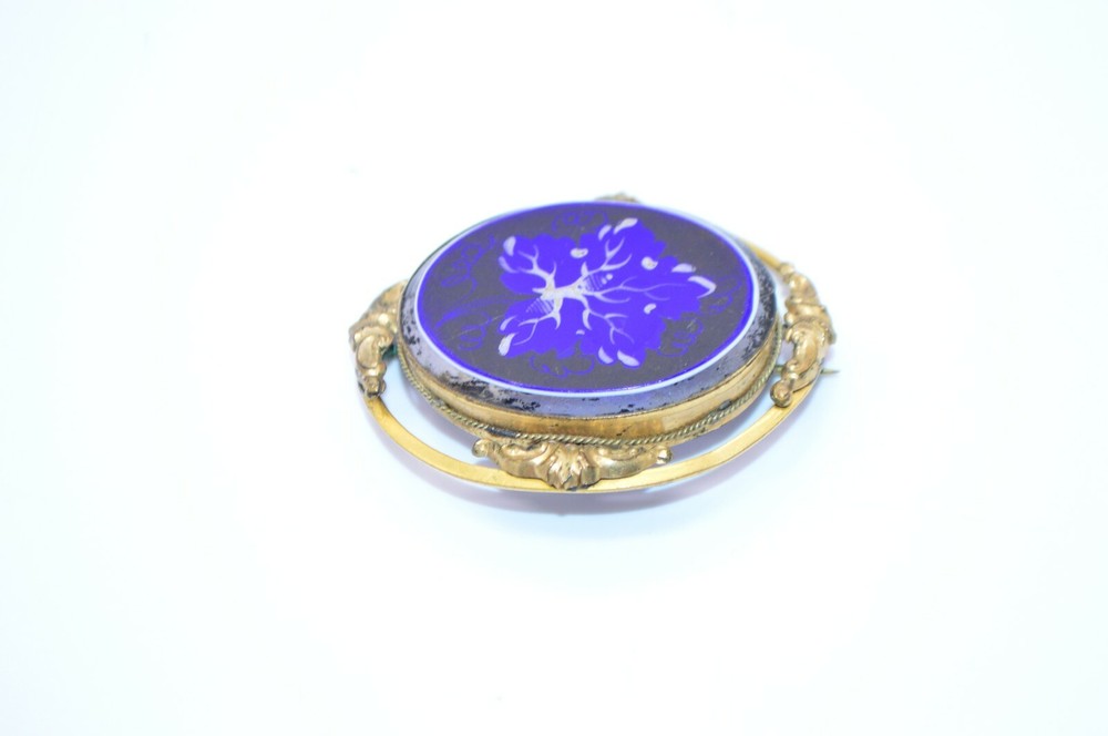 Victorian Gold Filled Blue and White Hand Painted Glass Brooch with C Clasp