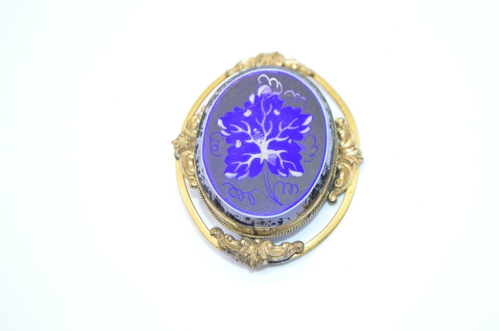 HomeVictorian Gold Filled Blue and White Hand Painted Glass Brooch with C Clasp