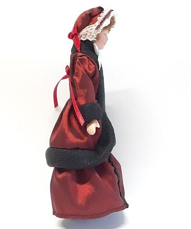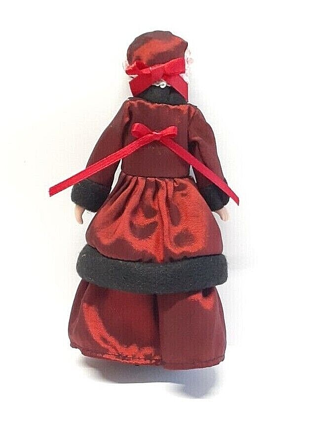 1/12 SCALE DOLLS HOUSE VICTORIAN LADY IN RED COAT AND BONNET . This "Victorian" lady has a cloth body with porcelain head and jointed arms and legs so she can be posed in a sitting position, she also has a brown hair wig. She is dressed in a dark red coat and gown with a matching bonnet Approx. Height = 6"(15cm) All our goods are professionally packed using the best materials.