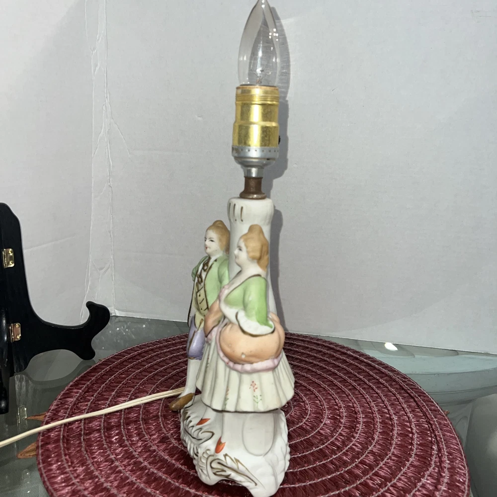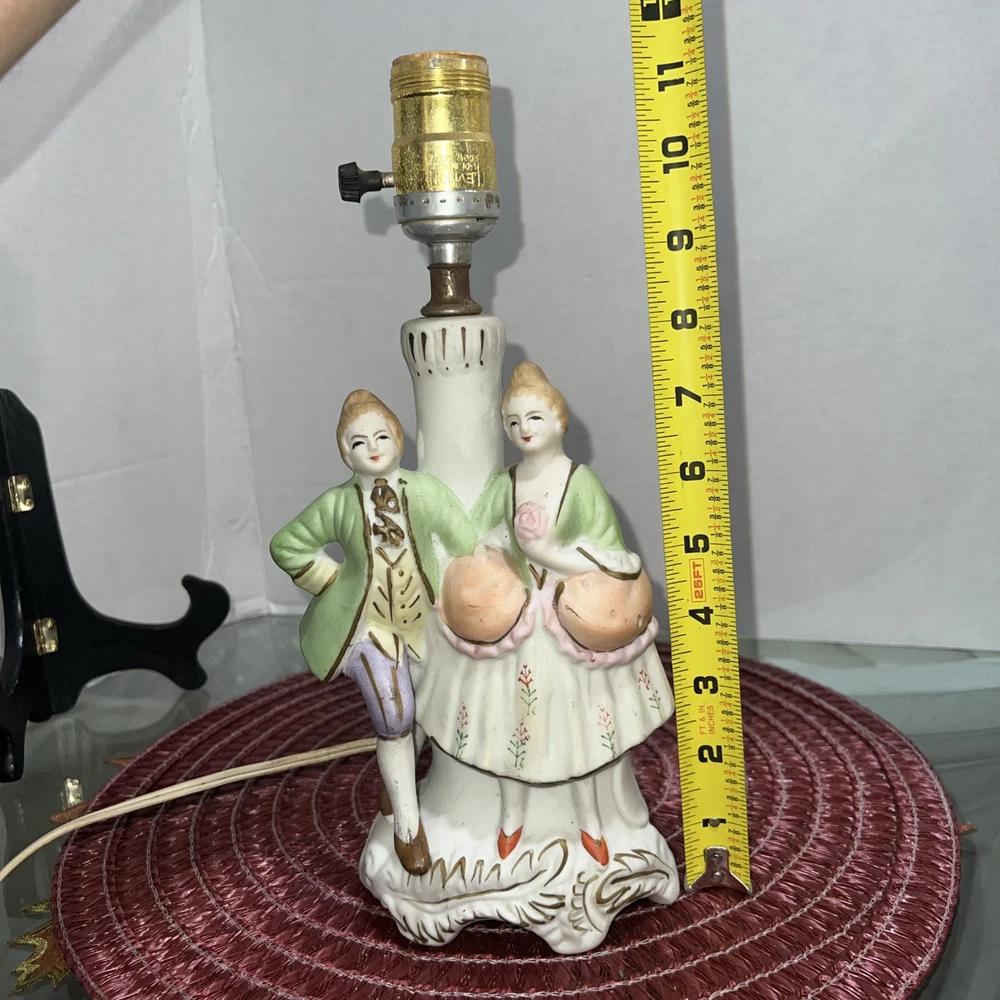 This Victorian table lamp features a courting couple design, making it ideal for a bedroom boudoir. The lamp is of vintage style, made of ceramic & porcelain with a multicolor finish. It is a medium-sized electric lamp with a white cord. Perfect for adding a touch of Victorian charm to your bedroom decor. Tested and working great Look at the pictures and ask questions before making your purchase