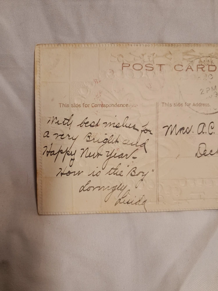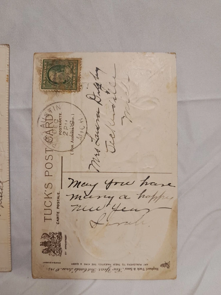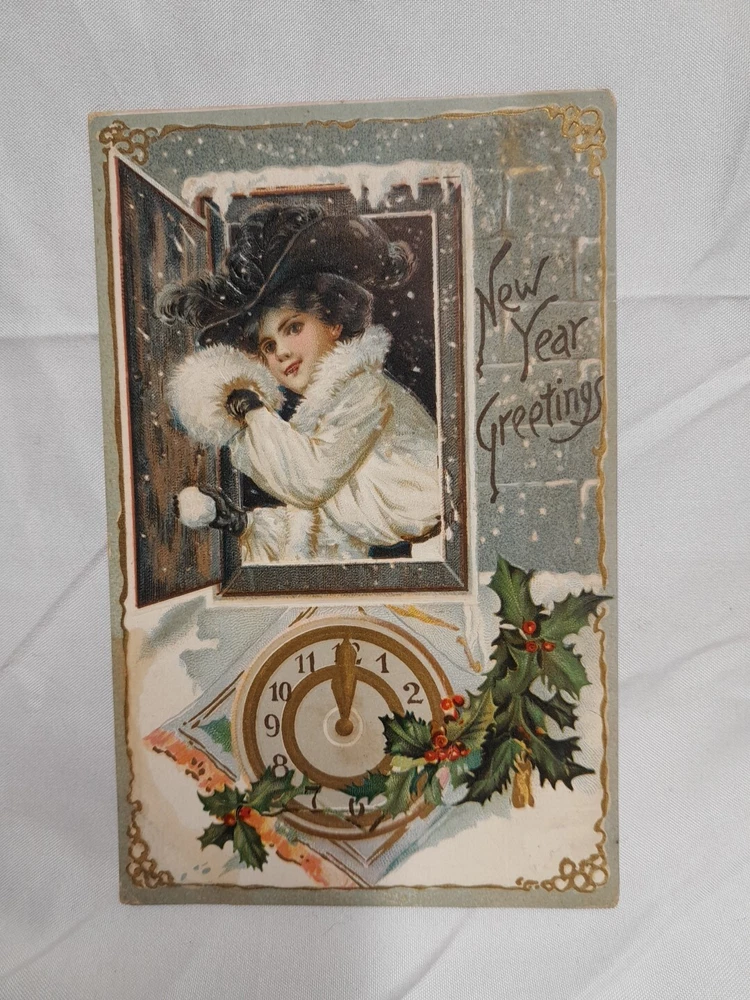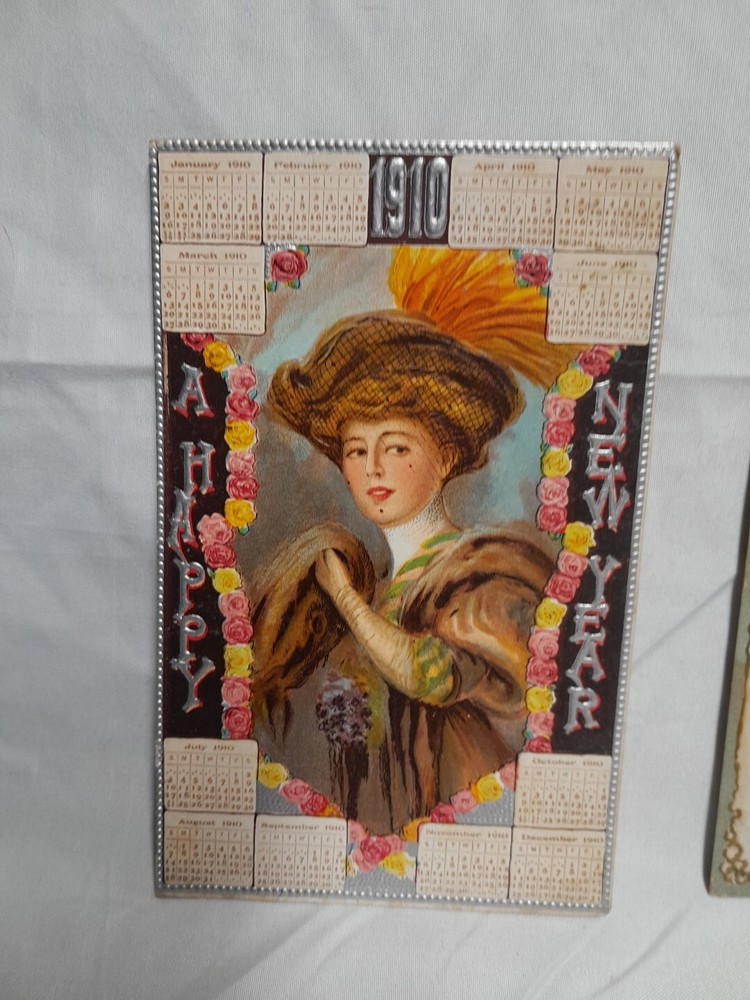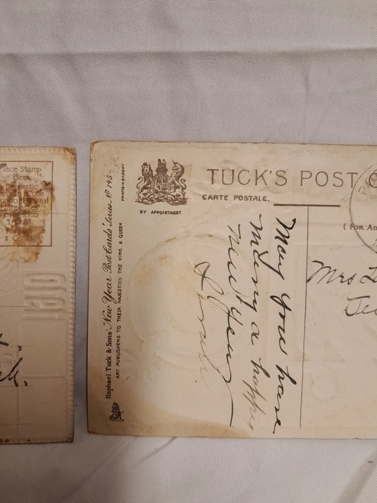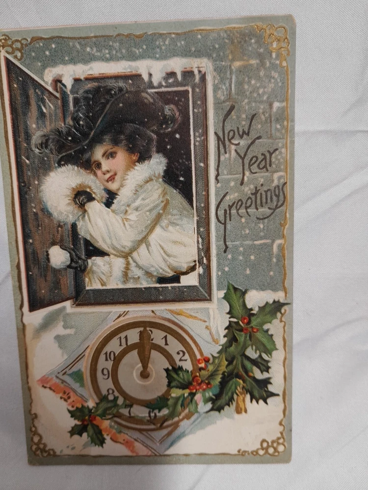Occasion: New Year Subject: New Year Postage Condition: Posted Number of Items in Set: 2 Era: Divided Back (1907-1915) Material: Paper gtin13: Does not apply Featured Person: woman Time Period Manufactured: 1900-1919 Artist: N/A Original/Licensed Reprint: Original Unit of Sale: Postcard Lot Brand/Publisher: Raphael Tuck & Sons Country/Region of Manufacture: Unknown Size: Standard (5.5 x 3.5 in) UPC: Does not apply Franchise: Raphael Tuck & Sons Theme: Beautiful Victorian Woman Year Manufactured: 1910 Character: Woman Signed: No Type: Printed (Lithograph) Features: Embossed Personalize: No