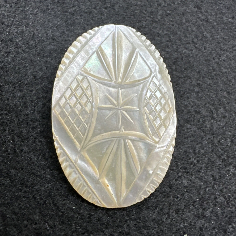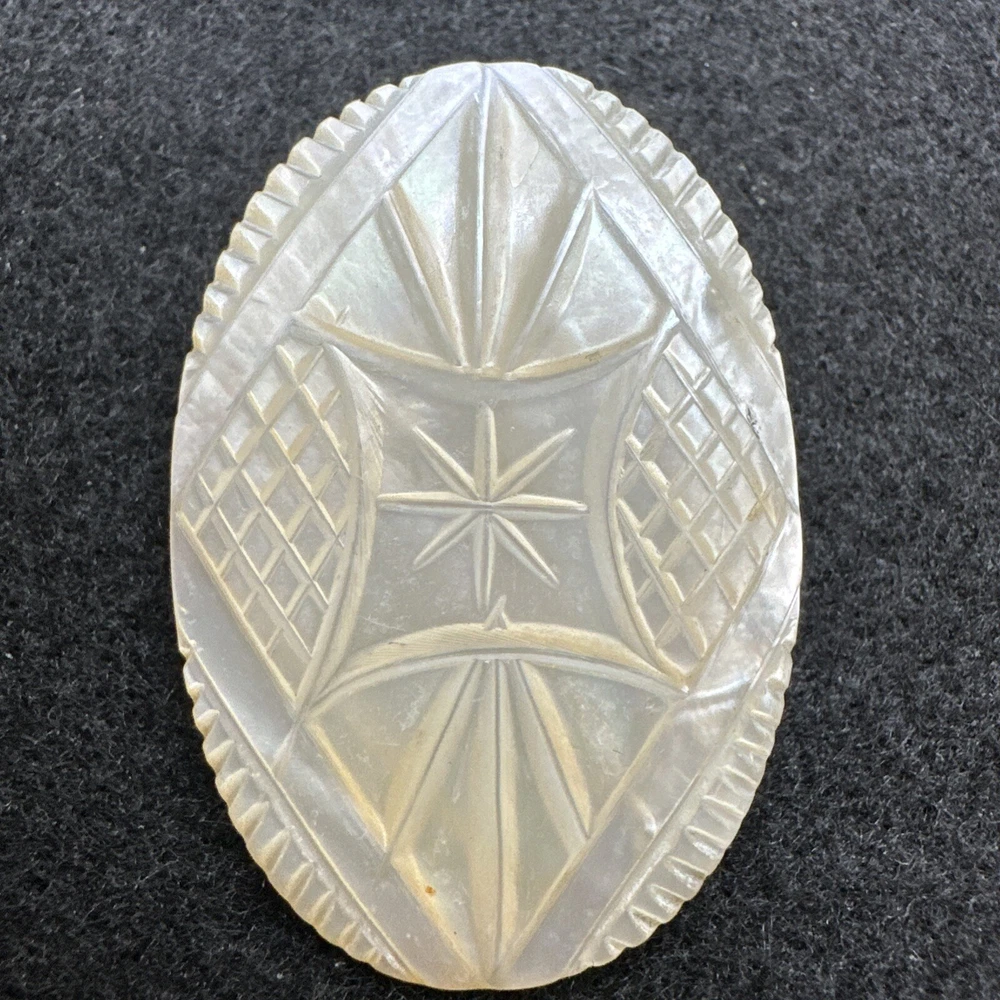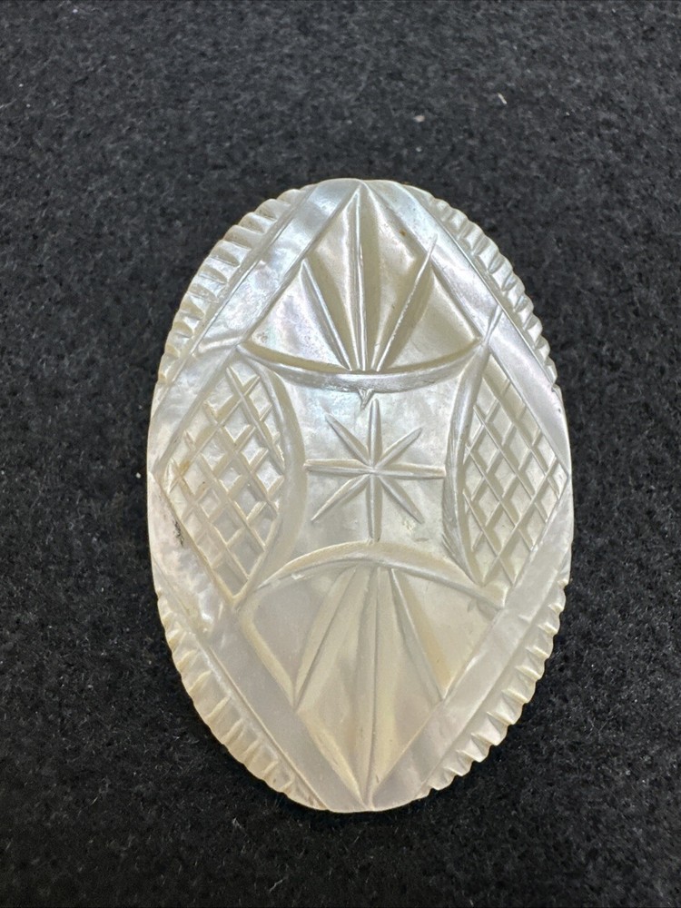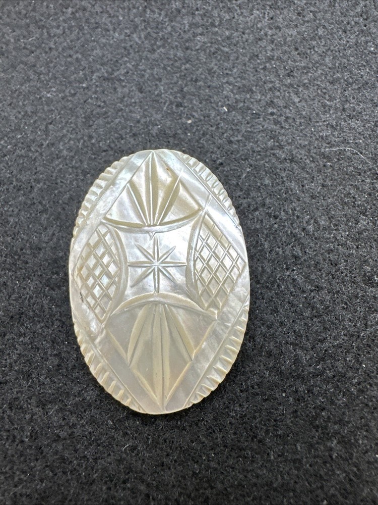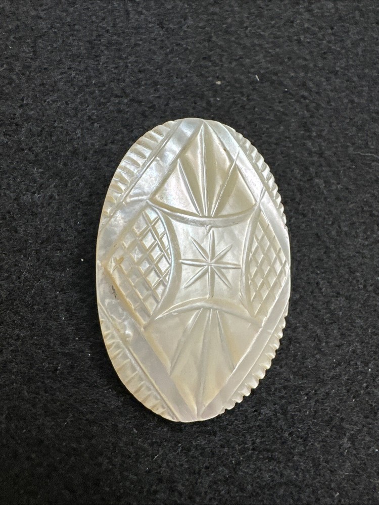 This beautiful oval brooch is a Victorian Mother-of-Pearl piece that exudes elegance and charm. The intricate design and craftsmanship of this antique jewelry item are evident in the delicate beige color and the unique shape. The brooch is made of Mother of Pearl material and is 2 inches in length, making it suitable for both men and women. The brooch is an original piece from the Edwardian era (1901-1910) and is a vintage item, making it a perfect addition to any antique collection. The brooch is a type of fashion accessory that can be worn on any occasion and adds a touch of sophistication to any outfit. The United States is the country of origin for this antique brooch, which is a must-have for any collector of vintage jewelry.