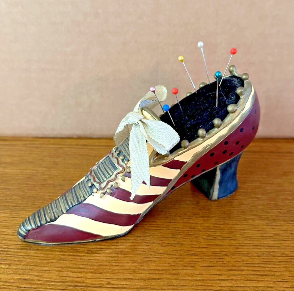 Vintage decorative Victorian-style ladies shoe-shaped pin cushion ~ Ceramic, hand painted Tan, maroon, gold and black with ribbon bow, and felt on sole and heel of shoe. 7" L x 3.75" H x 2" W Condition: Great condition with bold colors and no chips ~ Please see all photos Shipping: USPS Ground Advantage with tracking and shipping