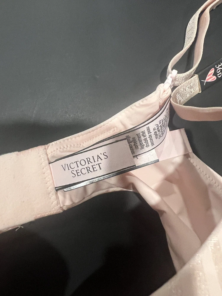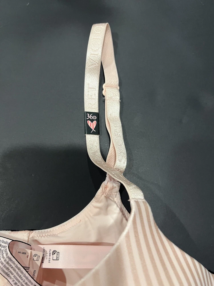 This Victoria's Secret bra is a T-shirt style in size 36D, featuring a pink striped design with lightly lined cups for a comfortable fit. It has a bra strap closure with underwired support, made from a polyamide blend fabric for a soft feel against the skin. The demi style offers a classic and timeless look, perfect for everyday wear. This new-with-tags bra is part of the Victoria's Secret Body By Victoria collection, designed for women seeking both style and comfort in their undergarments.