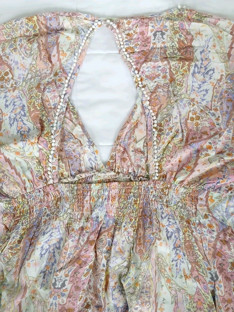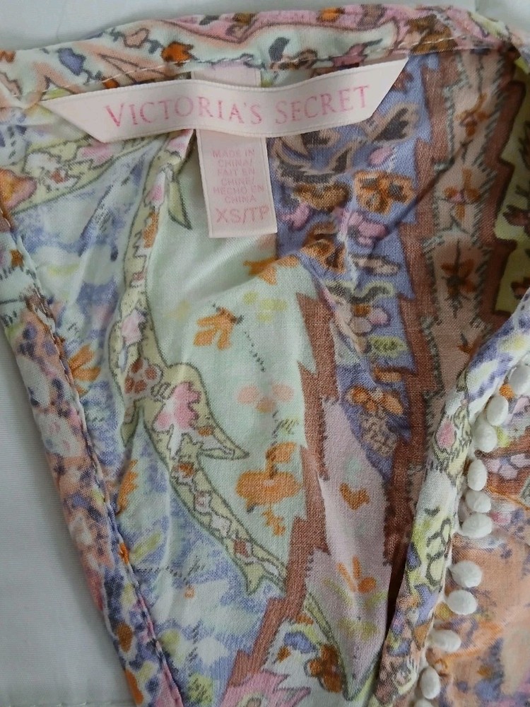 The Victoria's Secret Caftan in size XSmall is a stylish boho floral paisley swim cover with an open back, perfect for women looking for a lightweight and breathable cover-up. Made of viscose material, this multicolor garment features a bohemian theme and is machine washable for easy care. Its unique design and comfortable fabric make it an ideal choice for lounging by the pool or protecting your swimsuit while out in the sun.