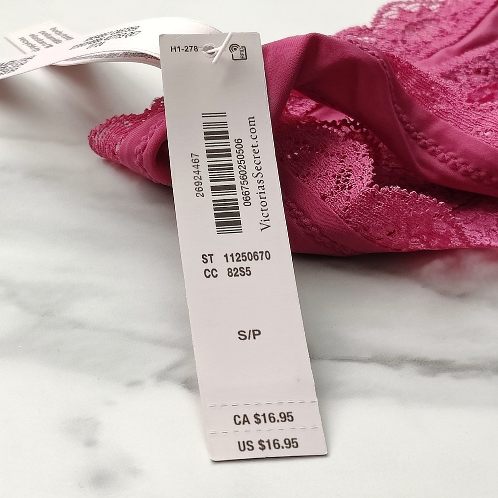 All photos are taken by Goob's Closet & Boutique and may not be reused without permission. Goob's Closet & Boutique lists on multiple platforms. If you choose to wait or "Watch", the listing may sell out on another platform first, and will then no longer be available for purchase on eBay without notice to you. This thong panty provides minimal back coverage with a low rise, offering both allure and ease. The lightweight, ultra-smooth FeatherSoft™ microfiber body glides with you, ensuring all-day comfort. Adorned with floral lace trim at the waist and leg openings, and a floral lace panel at the front, this panty adds a touch of beauty to your collection. A delicate rosette detail at the center front adds to its charm. The elastic at the waist ensures a secure yet comfortable fit. With an eco-friendly approach, it's partially made from recycled materials, and features a 100% cotton gusset for breathability. Easily machine washable, this panty combines comfort, style, and sustainability in one delightful package. Details Thong Style Minimal Back Coverage Low Rise Lightweight And Ultra-Smooth Buttery FeatherSoft™ Microfiber That Moves With You Floral Lace Trim At Waist And Leg Openings Floral Lace Panel At front Rosette Detail At Center Front Elastic At Waist Made Partially From Recycled Materials 100% Cotton Gusset Style No. 11250670 Material Body: 71% Recycled Polyamide, 29% Elastane Trim: 53% Recycled Polyamide, 30% Polyamide, 17% LYCRA® ADAPTIV ™ Elastane Gusset: 100% Cotton Care Machine Wash Measurements Victoria's Secret Size Small (S) will fit US Size 4-6, Waist 26-27 inches, Hips 36.5-37.5 inches best. Victoria's Secret Size Medium (M) will fit US Size 8-10, Waist 28-29 inches, Hips 38.5-39.5 inches best. Victoria's Secret Size Large (L) will fit US Size 12-14, Waist 30.5-32 inches, Hips 41-42.5 inches best. Victoria's Secret Size Extra Large (XL) will fit US Size 16-18, Waist 34-36 inches, Hips 44.5-46.5 inches best.