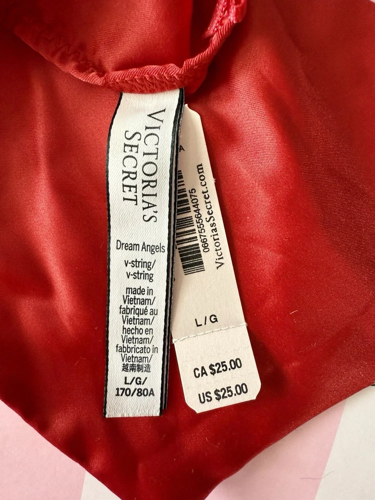 Victorias Secret Dream Angels Red Satin Bow V-String Panty L Rhinestone Accent. Condition is New with tags. Shipped with USPS Ground Advantage.