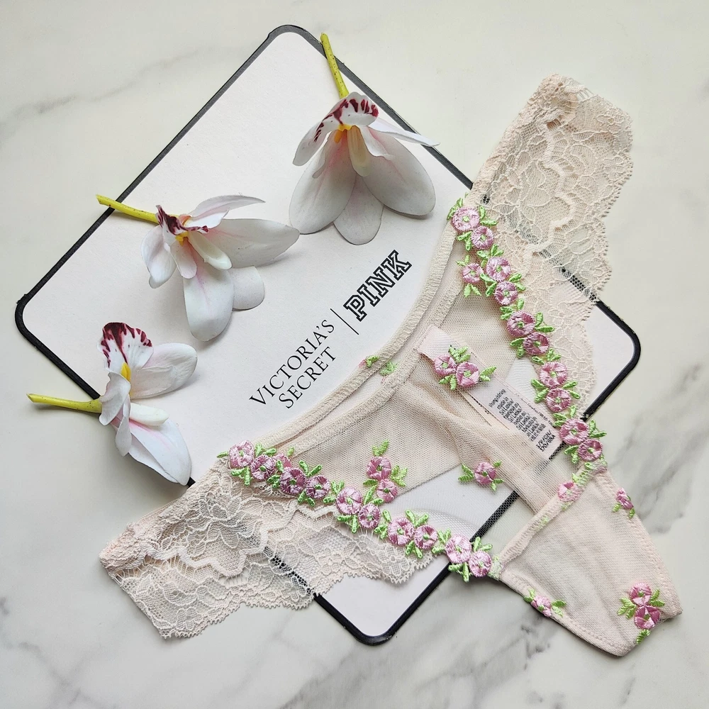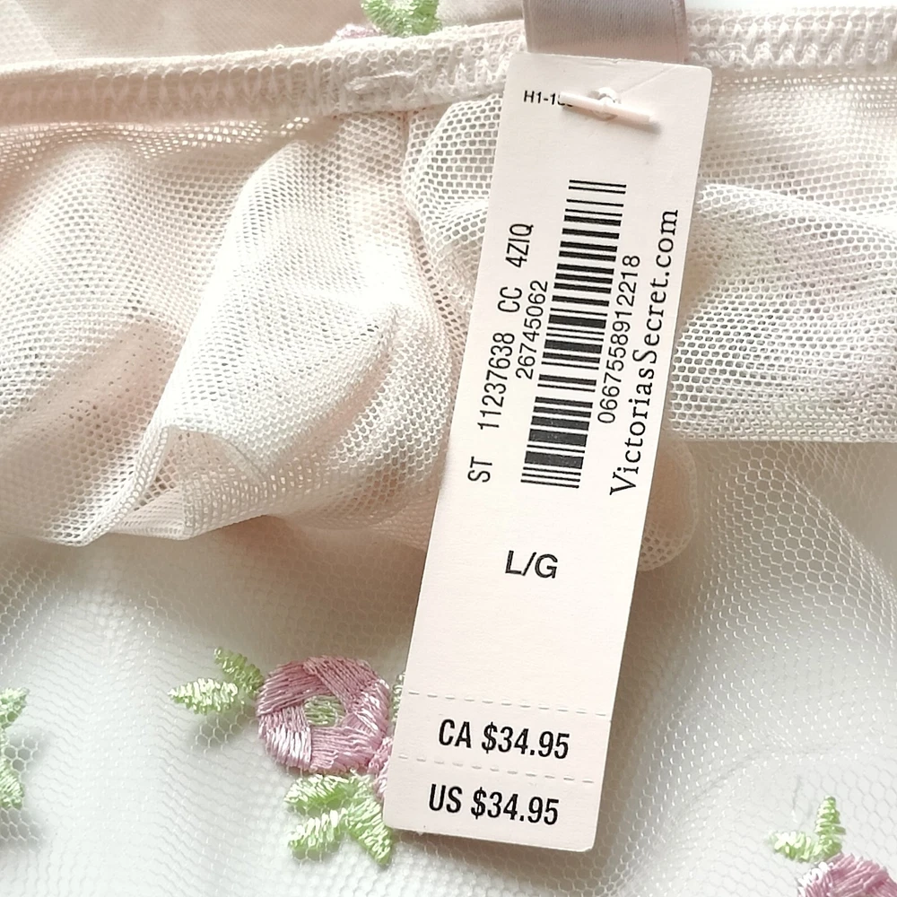 All photos are taken by Goob's Closet & Boutique and may not be reused without permission. Goob's Closet & Boutique lists inventory on multiple platforms. If you choose to wait to purchase or "Watch" this item, it may sell out on another platform first, and will then be removed from eBay without notice to you. This thong-style panty provides minimal back coverage and a low-rise fit for a comfortable and stylish look. The front and back panels features sheer mesh, offering a delicate and airy feel. The floral lace side panels add an enchanting touch, and the 3D floral rosebud embroidery at the front and back provides beautiful detail, giving this panty a unique and romantic appearance. The elastic at the waist and leg openings ensures a secure and comfortable fit, and the 100% cotton gusset provides breathability where it’s needed most. Details Thong Style Minimal Back Coverage Low Rise Sheer Tulle Mesh Front Panel Sheer Mesh Back Panels Floral Lace Side Panels 3D Floral Rosebud Embroidery at Front and Back Elastic at Waist and Leg Openings Made Partially from Recycled Materials 100% Cotton Gusset Style No. 11237638 Material Body: 100% Polyamide Embroidery: 100% Polyester Lace: 65% Recycled Polyamide, 24% Polyamide, 11% Elastane Back: 88% Polyamide, 12% Elastane Gusset: 100% Cotton Care Machine Wash Measurements Victoria's Secret Size Small (S) will fit US Size 4-6, Waist 26-27 inches, Hips 35.5-37.5 inches best. Victoria's Secret Size Medium (M) will fit US Size 8-10, Waist 28-29 inches, Hips 38.5-39.5 inches best. Victoria's Secret Size Large (L) will fit US Size 12-14, Waist 30.5-32 inches, Hips 41-42.5 inches best. Victoria's Secret Size Extra Large (XL) will fit US Size 16-18, Waist 34-36 inches, Hips 44.5-46.5 inches best.