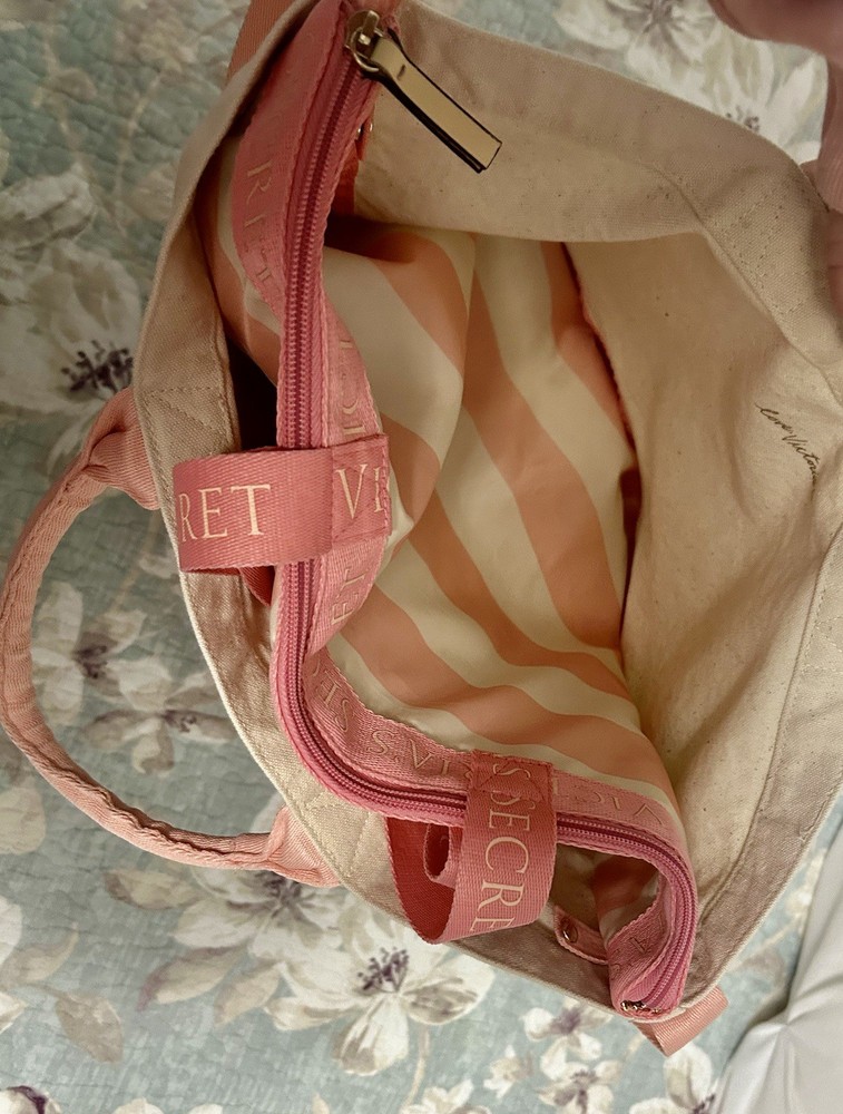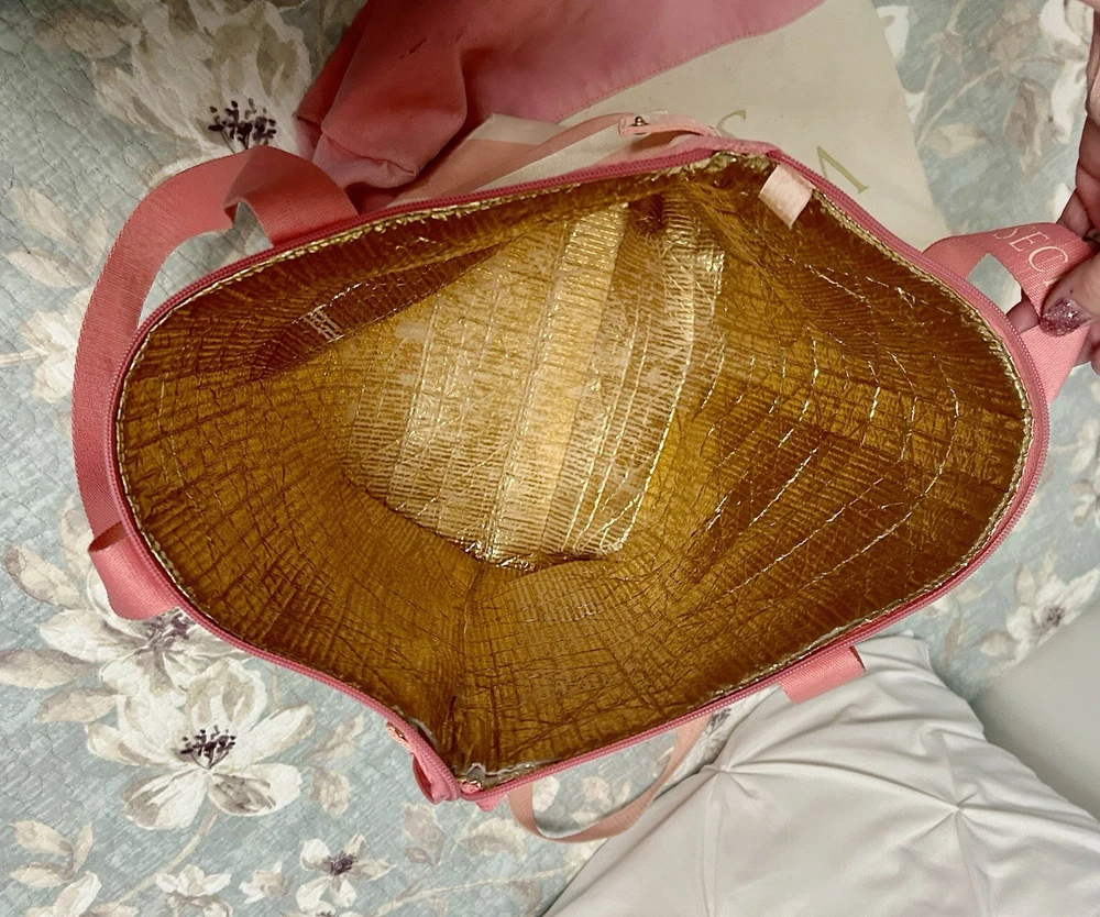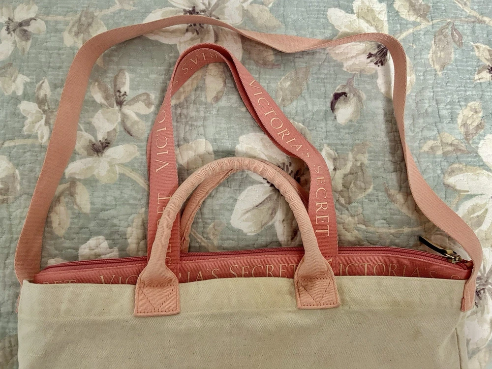 The Victoria's Secret Cooler Tote Bag is a stylish and functional beach bag that features a removable insulated interior, making it perfect for keeping drinks cool by the pool or at a picnic. The bag is designed with a zip closure and pink accents, adding a touch of playfulness to the classic tote style. The exterior and lining materials are both canvas, with the gold lining creating a luxurious contrast to the pink accents. This versatile bag is ideal for travel, casual outings, or beach parties, and includes additional accessories like a pouch and other strap for added convenience.