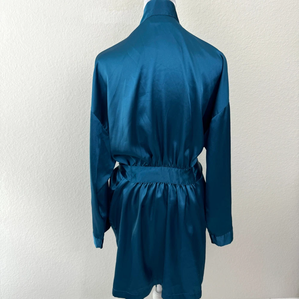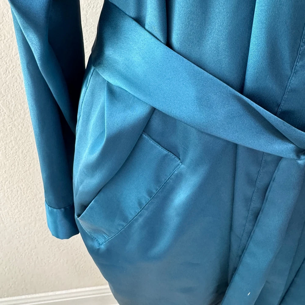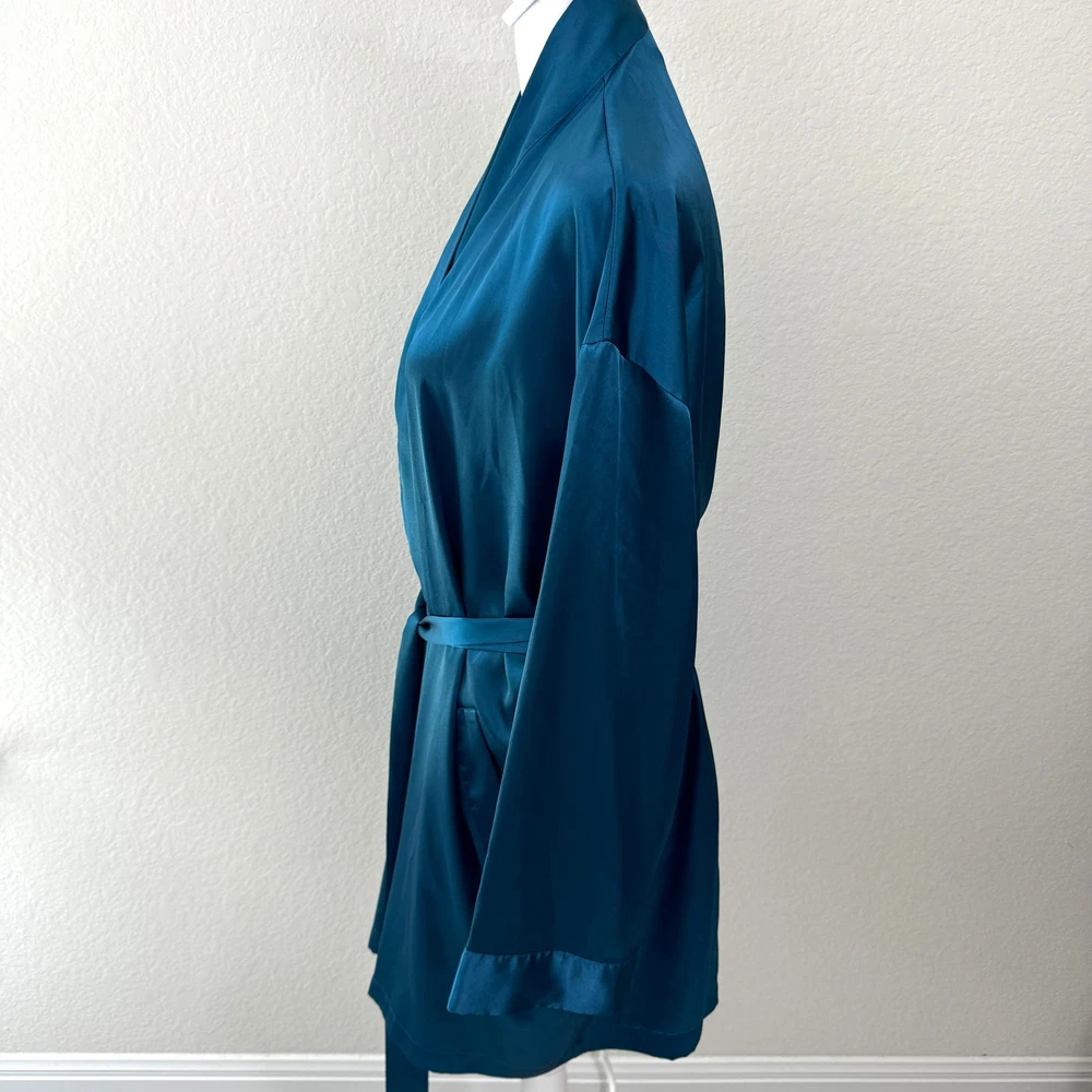 Brand: Victoria's Secret Size: One Size Measurements: Please see photos for approximate measurements. Condition: In good pre-loved condition. Small dark spot on front-see photos Color: Dark blue green teal Material: Poly Features: Interior waist tie Belted, attached waist tie Pockets Knee length Wider sleeves Lightweight silky feel fabric Tags: intimates, sleepwear, pajamas, loungewear, relax, stay at home, cozy, comfy, casual, night, sleep Pre-owned clothing items are properly cleaned, washed, and/or steamed at high heat before listing.