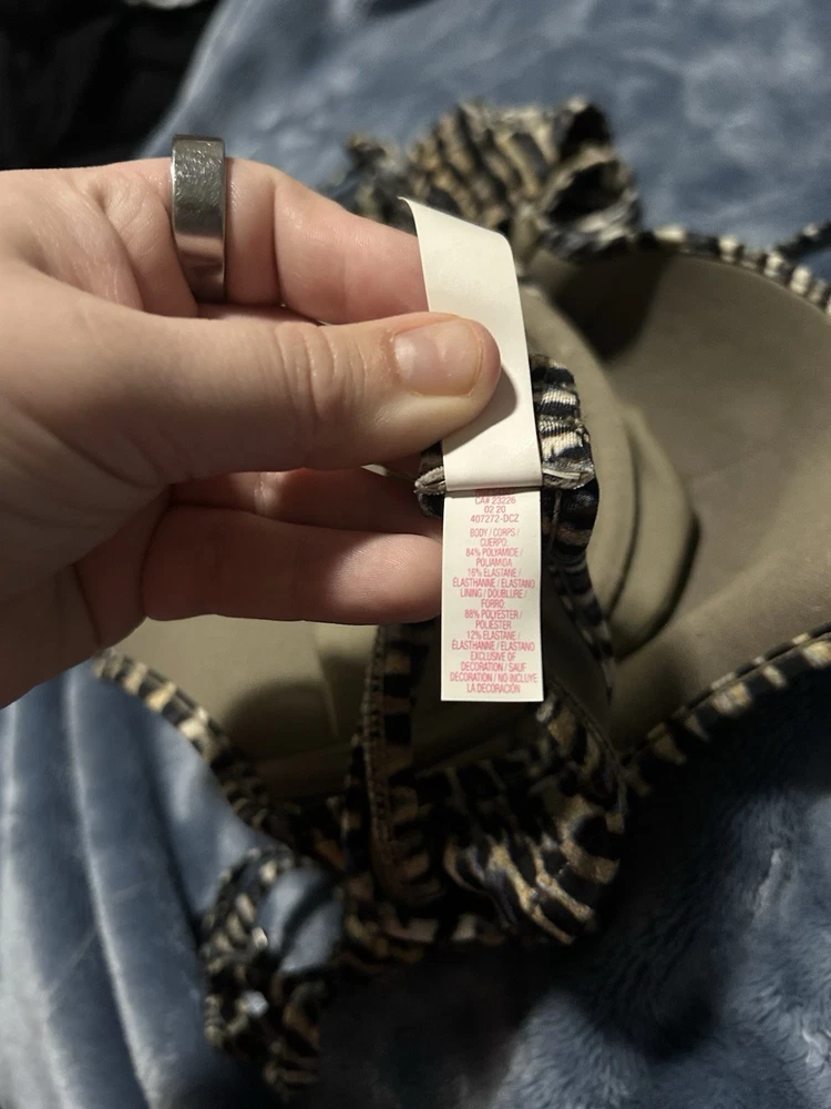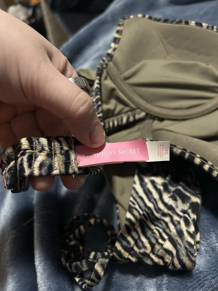 Victoria’s Secret Leopard Bikini. Top is a 34c, bottoms have no size but look to be a medium. Will measure if asked. Top is a halter style with beaded ties. Bottoms also have beaded ties.