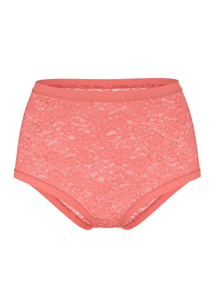 PRODUCT DESCRIPTION This sleek, ultra-comfy Brief features our flirty, new floral lace edged with smooth and stretchy, raw-cut fabric for a nearly invisible look under clothes. High rise Full back coverage: shows curves Perfect for workouts and pairing with activewear Cotton gusset panel Partially made from recycled materials Machine wash Imported Composition Body: 77% Recycled Polyamide 12% Polyamide 11% Elastane Gusset: 100% Cotton Exclusive of Decoration Color: Coral Ribbon Size: XL