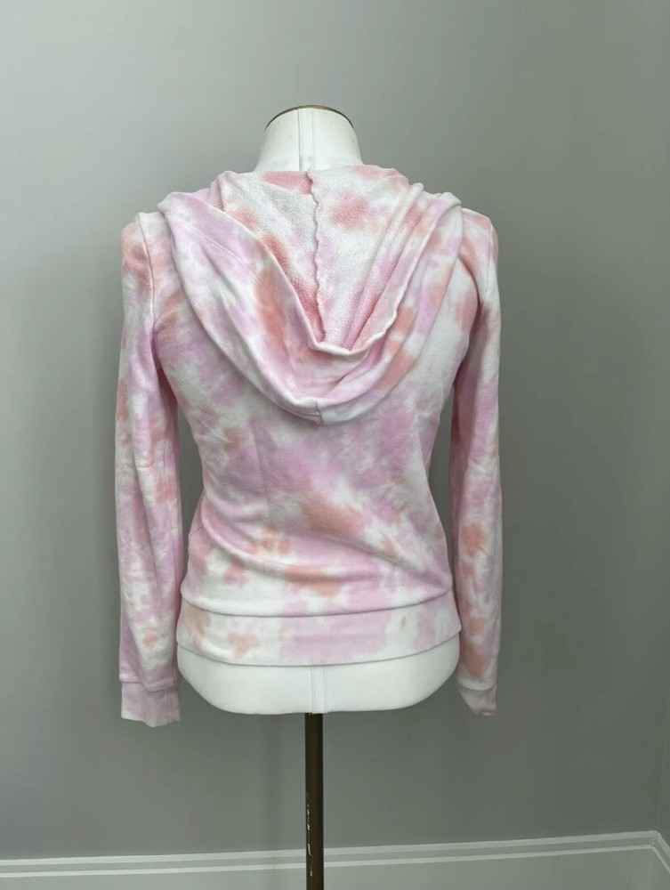VS PINK Tie-Dye Hooded Zip Front Sweatshirt ~ Size XS. Used good condition 78% cotton 22% polyester Small snags that you can’t tell Hole depicted in the photo Half zipper cut off, but can still zip up all the way Pit to pit: 18.5 inches Length without hood: 22 inches Sleeves: 21 inches Smoke-free home