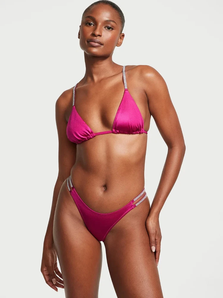 Victoria's Secret Swim Double Shine Strap Brazilian Bottom Berry Blush Infused with plenty of glam, this pair dazzles with skinny, double shine straps that glitter in the sun. *BRAZILIAN BIKINI BOTTOM ONLY* This is not a set. Low rise High-cut leg Double rhinestone straps Minimal back coverage: lots of cheek peek Hand wash Sizes: S, L