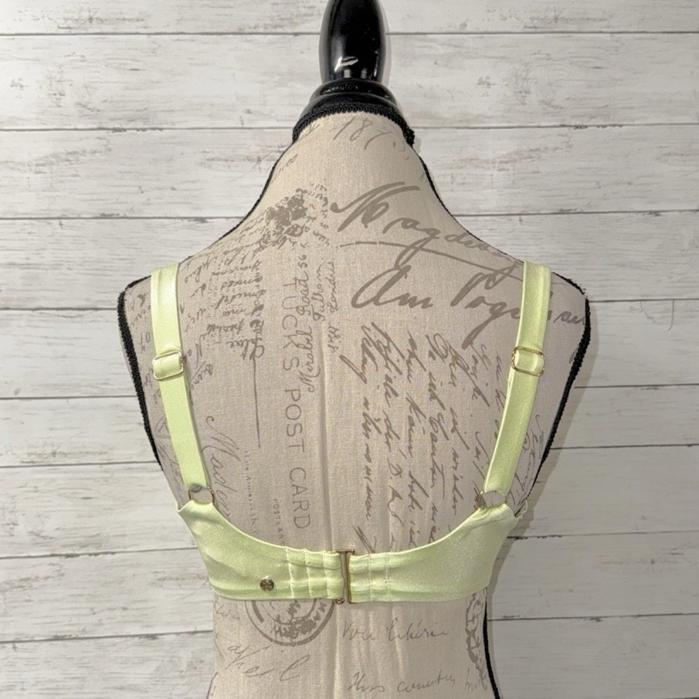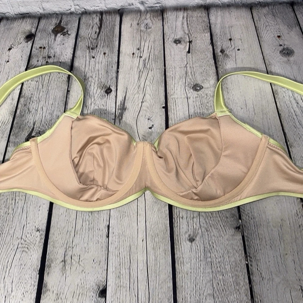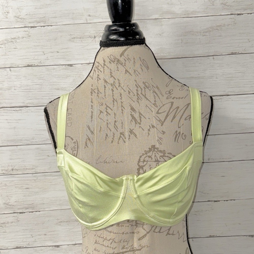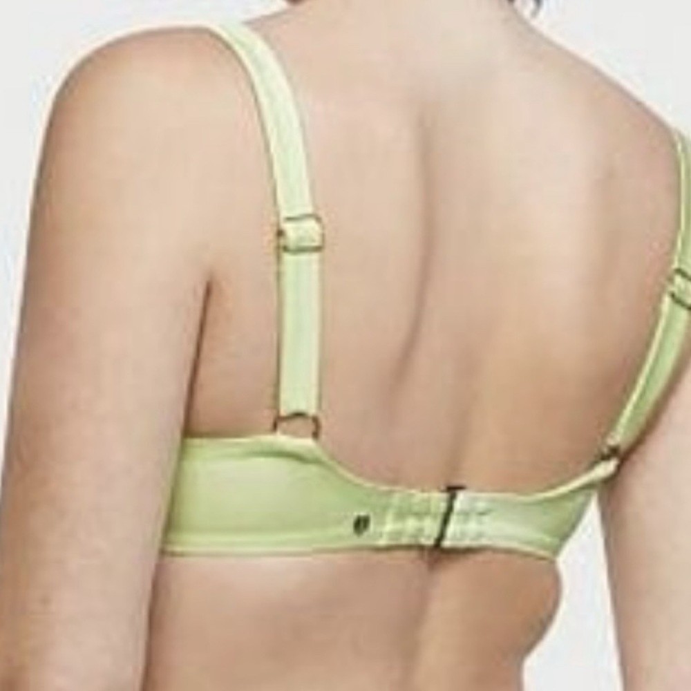 Victoria’s Secret size 34DDD swim top in the color “iced olive”. Gold tone hardware. Lined cups with underwire. Comfortably wide adjustable shoulder straps. Adjustable swan hook back close. 80% Polyamide, 20% Elastane Perfect condition!