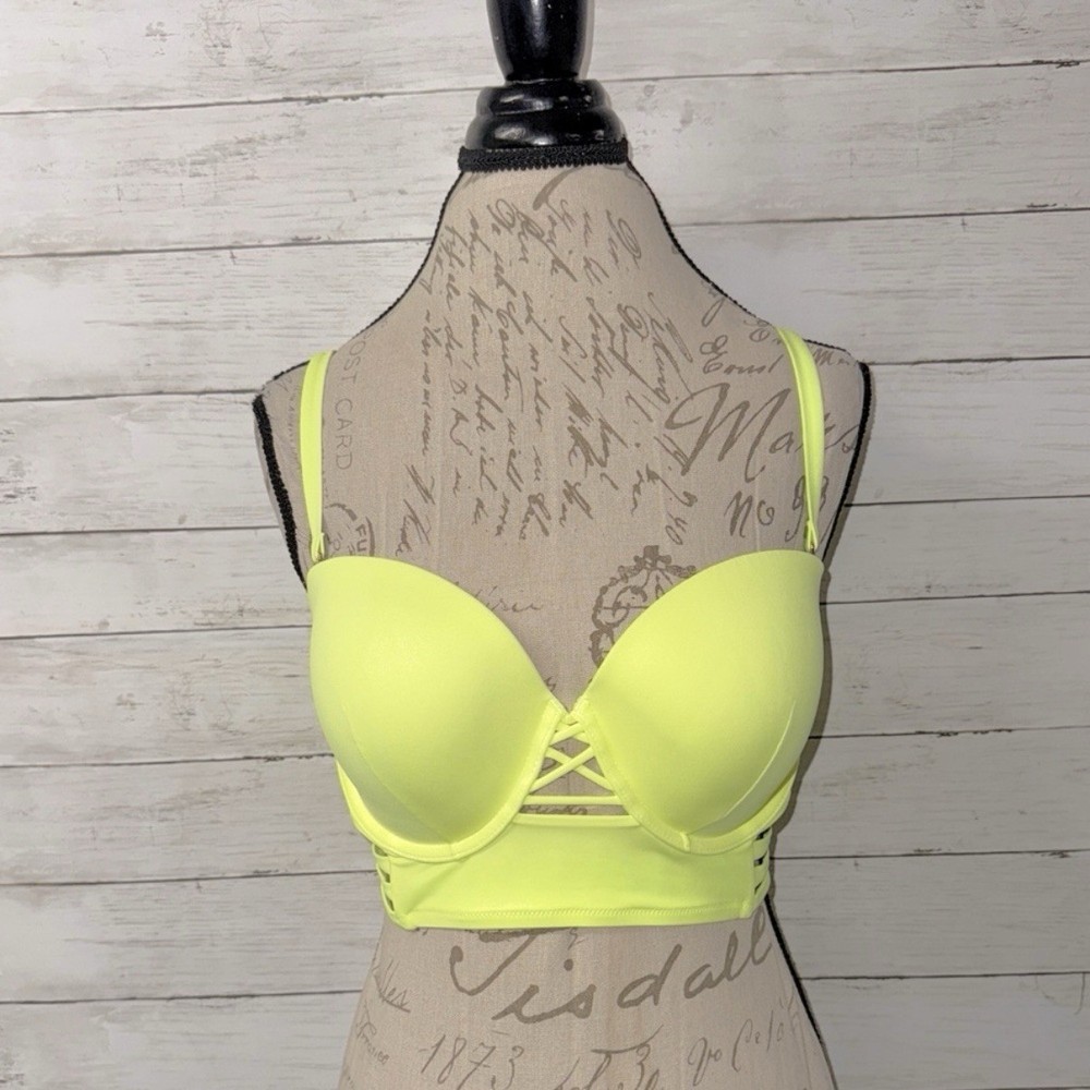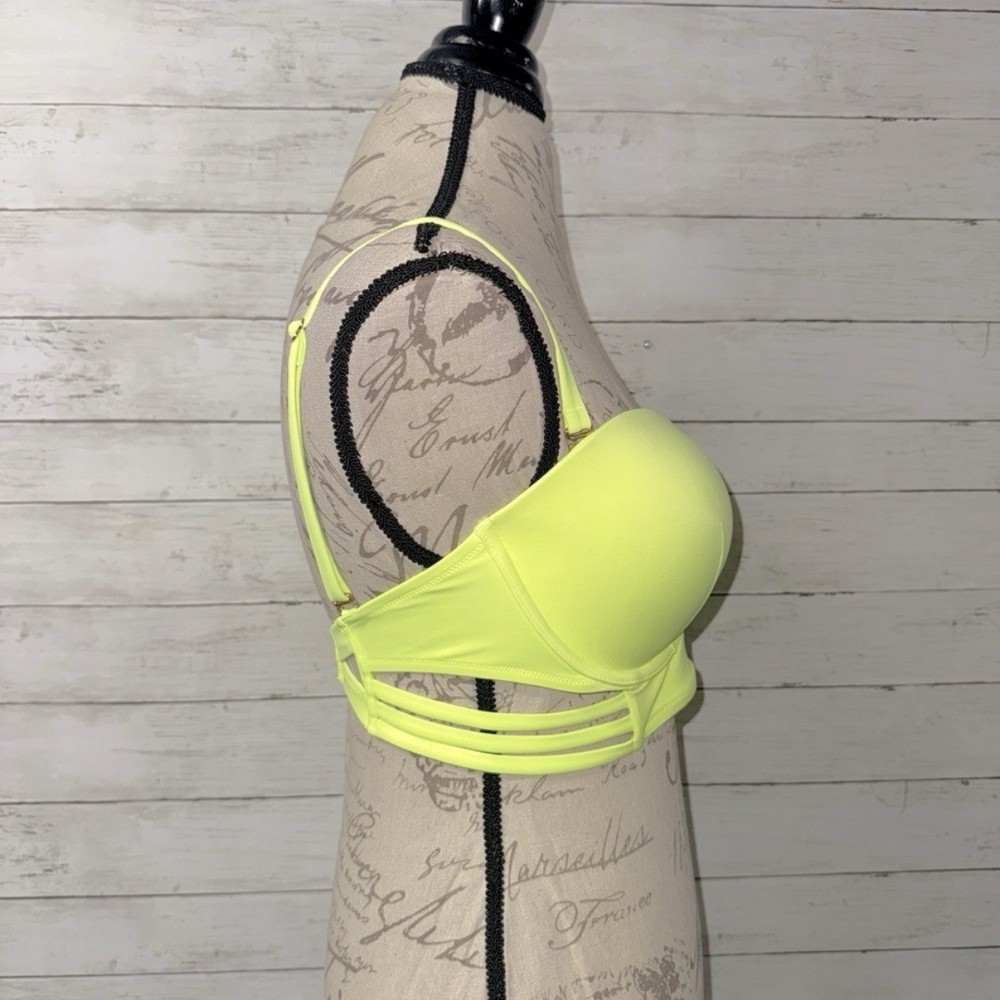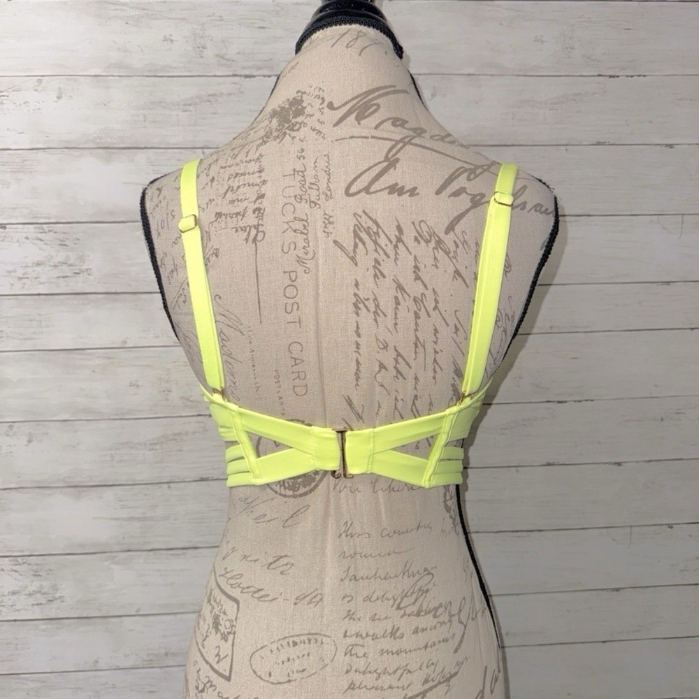 Victoria’s Secret size 36DD bikini top in highlighter yellow. Push up cups with underwire. Optional clip on adjustable length shoulder straps. Triple straps along longline bottom. Decorative back panel with supportive boning & gold tone swan hook back close. 80% Polyamide, 20% Elastane Worn only once- perfect condition!