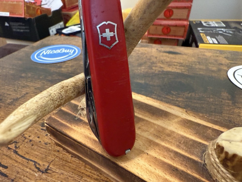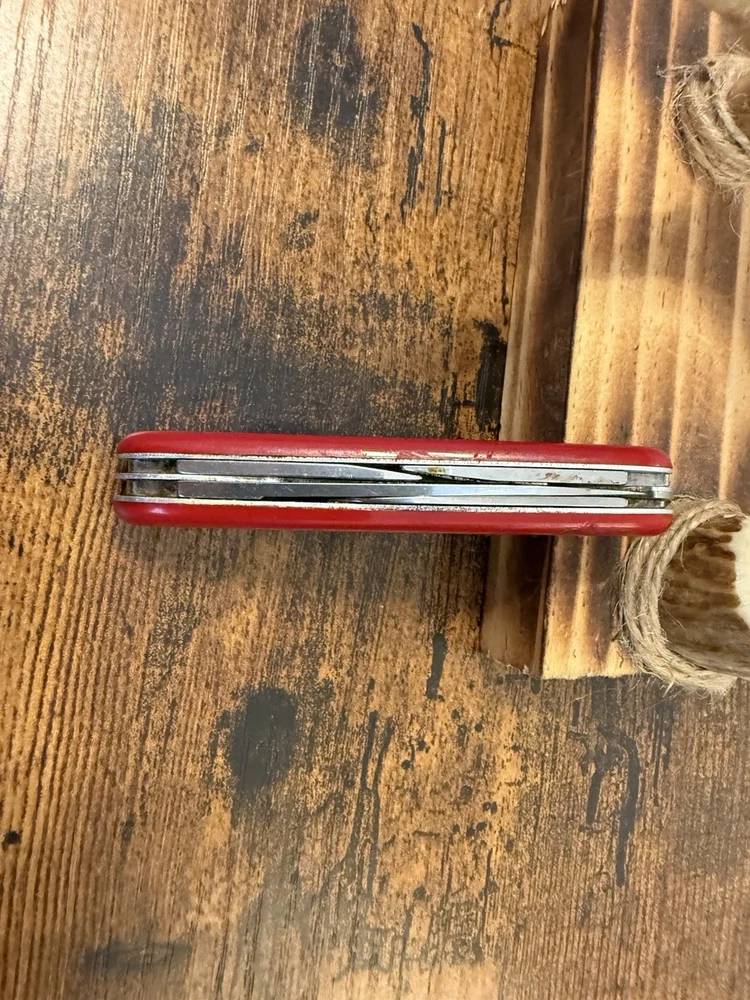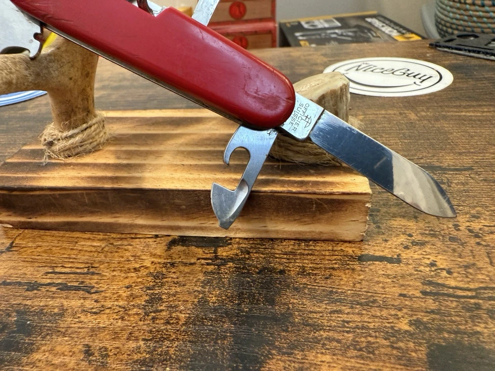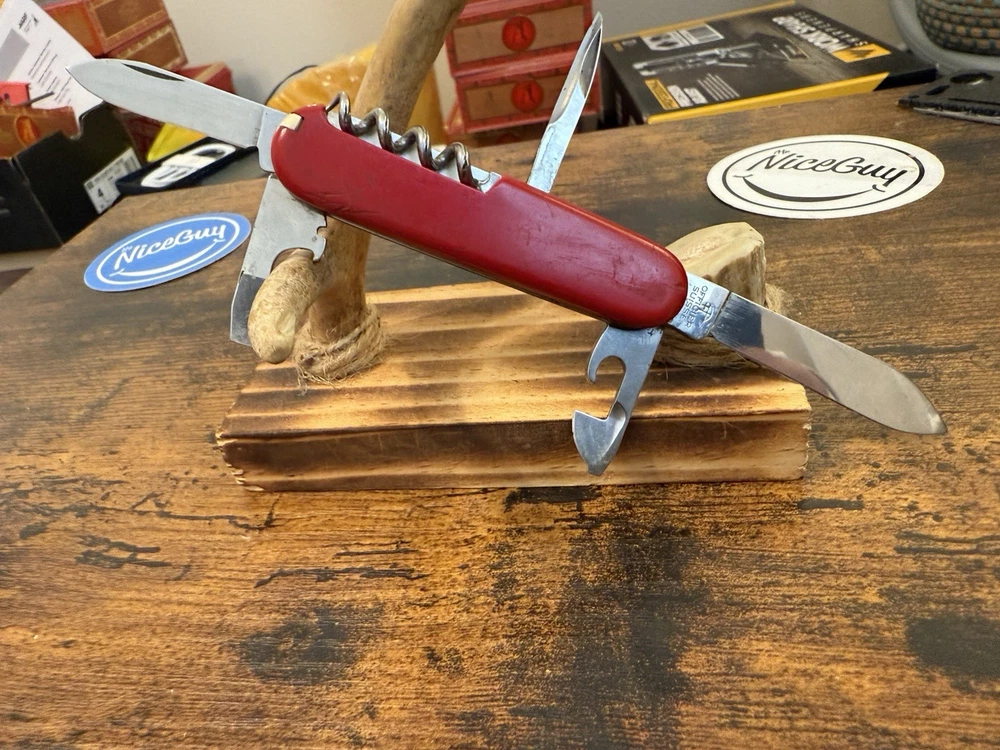 The Victorinox 91mm Spartan / Standard Swiss Army Knife is a vintage multi-tool with two blades: a drop point and a clip point. The knife features a slipjoint lock type and a manual opening mechanism. The handle is made of durable cellidor plastic in a classic red color. This iconic knife is a versatile and reliable tool for various tasks, making it a must-have for outdoor enthusiasts and collectors alike.