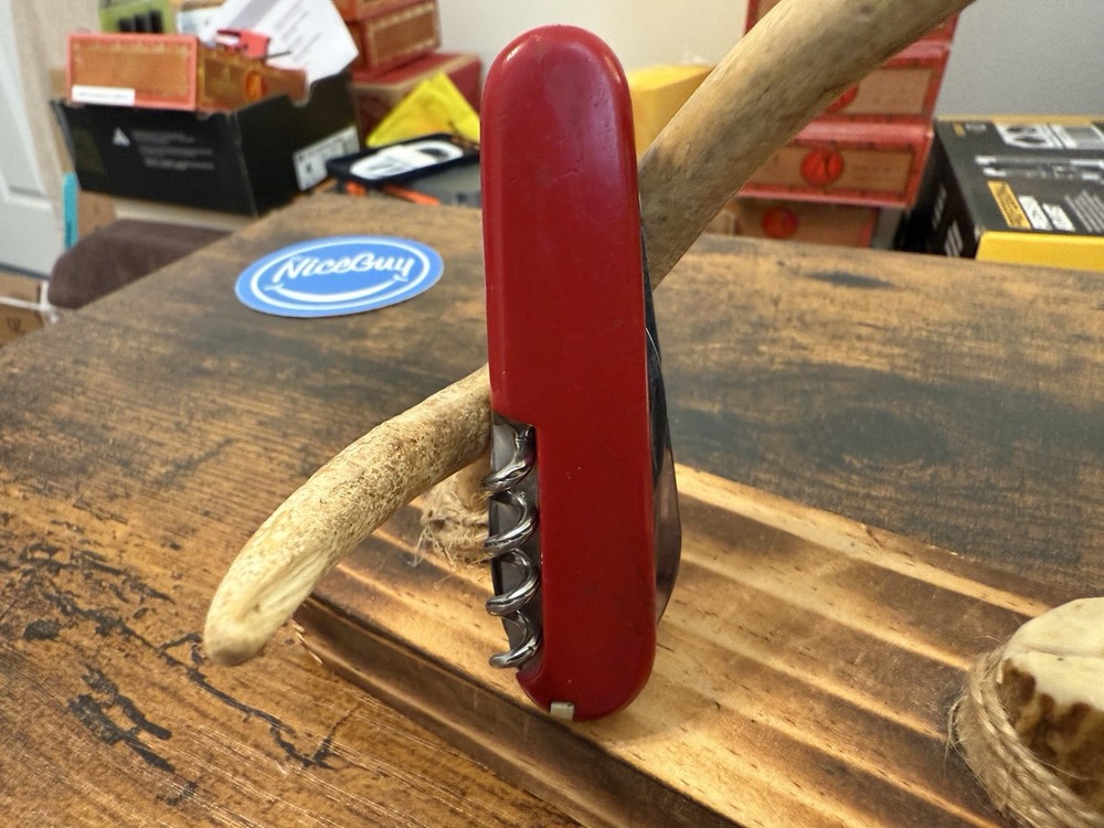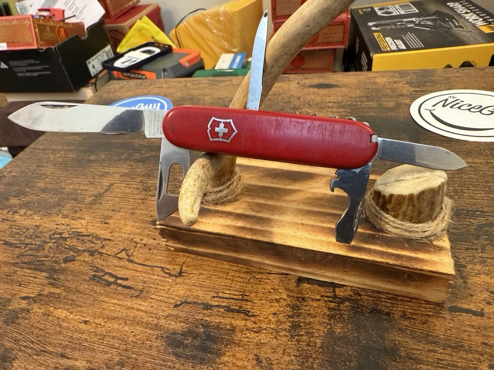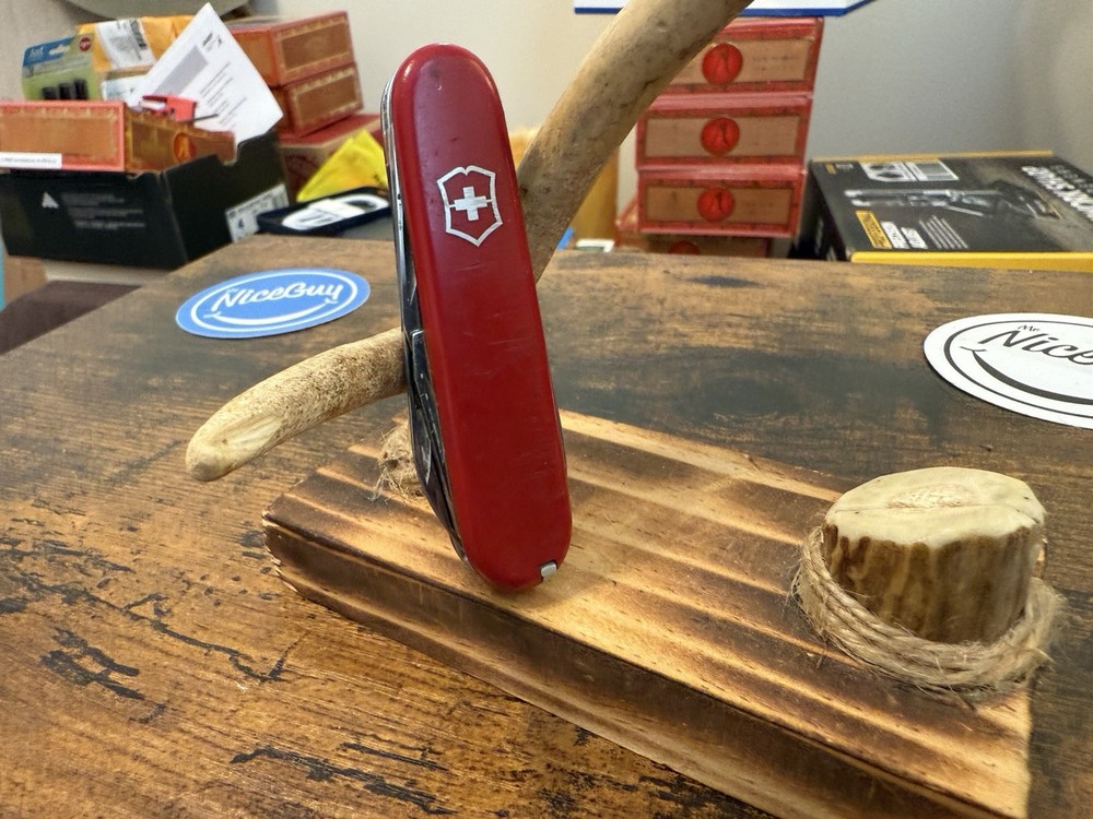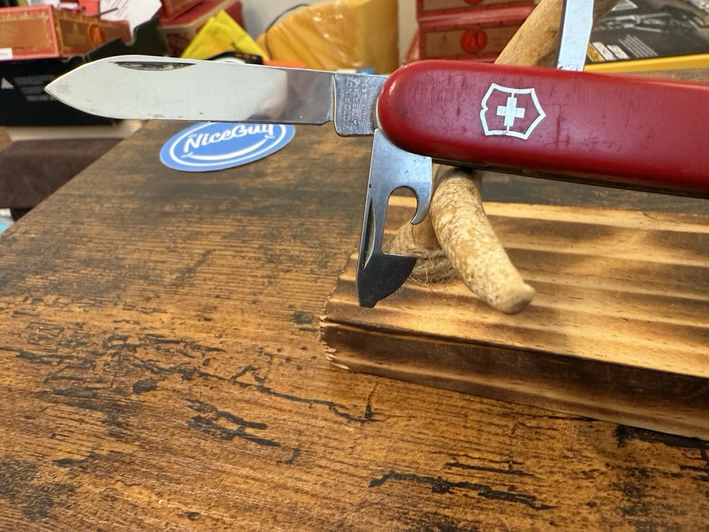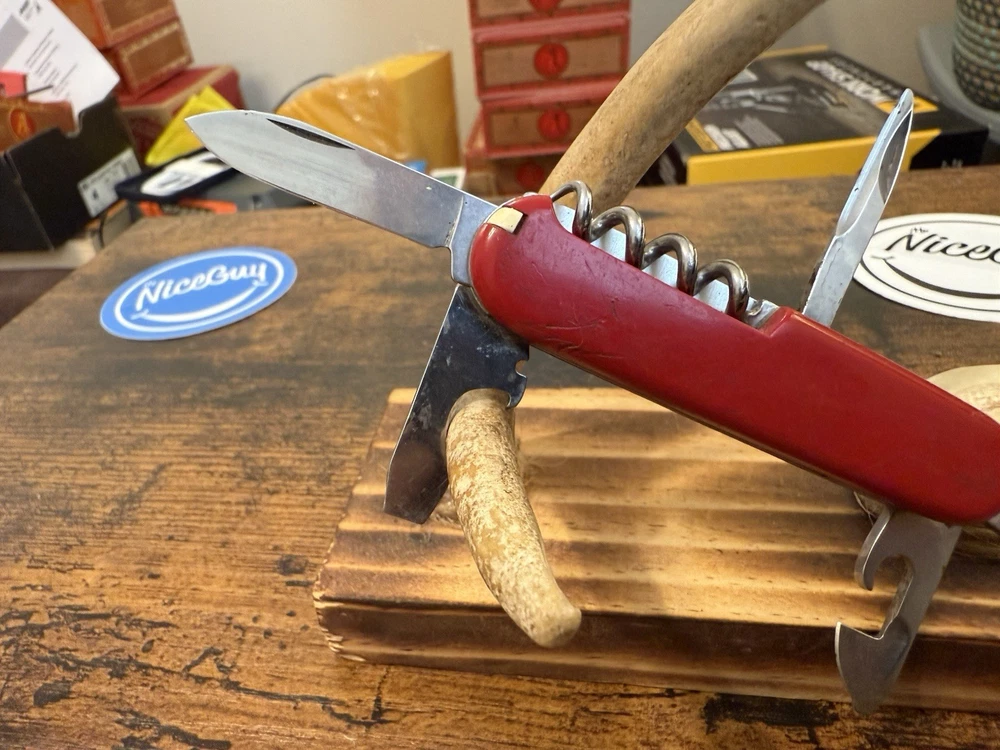 The Victorinox 91mm Spartan / Standard Swiss Army Knife is a vintage multi-tool with two blades: a drop point and a clip point. The knife features a slipjoint lock type and a manual opening mechanism. The handle is made of durable cellidor plastic in a classic red color. This iconic knife is a versatile and reliable tool for various tasks, making it a must-have for outdoor enthusiasts and collectors alike.