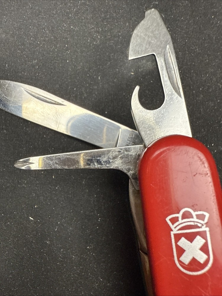 The Victorinox Explorer Swiss Army Knife with a magnifying glass is a versatile and compact tool perfect for outdoor enthusiasts. Made with stainless steel blades, this pocketknife features a spear point blade and a range of useful tools including a punch, corkscrew, scissors, screwdriver, bottle opener, and more. The red-colored handle is made of Cellidor material and the knife is ambidextrous, making it suitable for both left and right-handed users. Perfect for fishing, camping, or any outdoor activity, this original 1980s model from Switzerland is a must-have for any collection of modern folding knives. Non-branded side of the knife has a crack near where the tweezers would normally go. doesn’t impact knife performance.