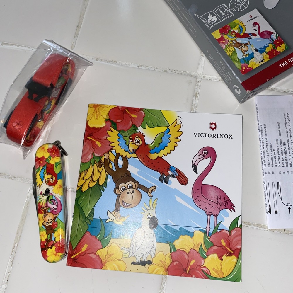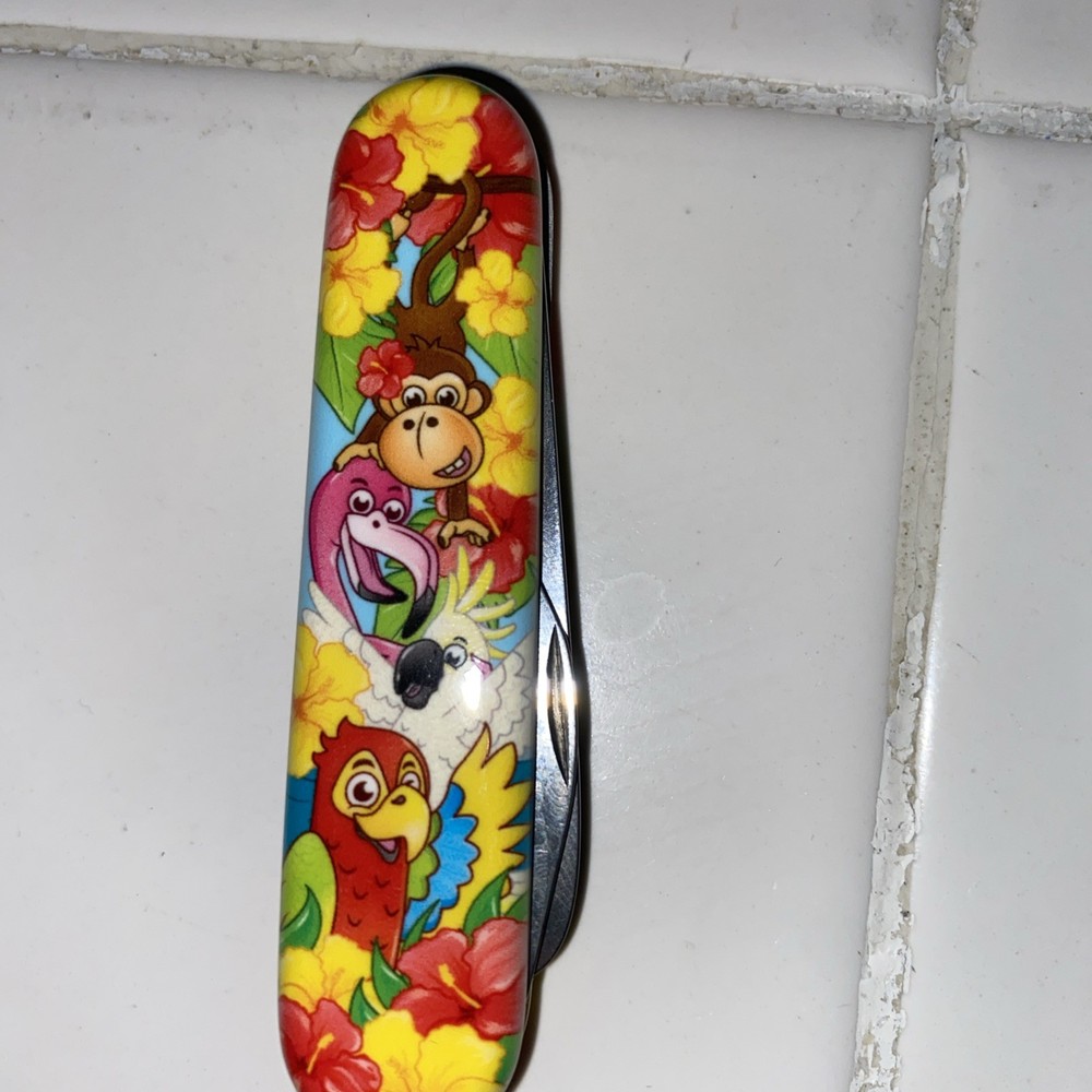 The VICTORINOX MY FIRST Animal Edition Parrot knife is a 84mm folding knife designed specifically for kids to enjoy outdoor activities. With a vibrant parrot color and a cute animal design, this knife features the iconic Victorinox brand and model number 0.2373.E3. This collectible folding knife is perfect for young adventurers to learn about tools and develop their outdoor skills in a fun and safe manner. Made by the renowned manufacturer Victorinox, this knife ensures quality and durability for years to come. Brand new!!